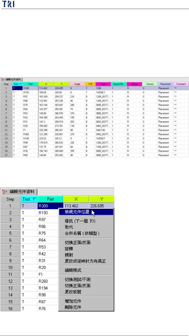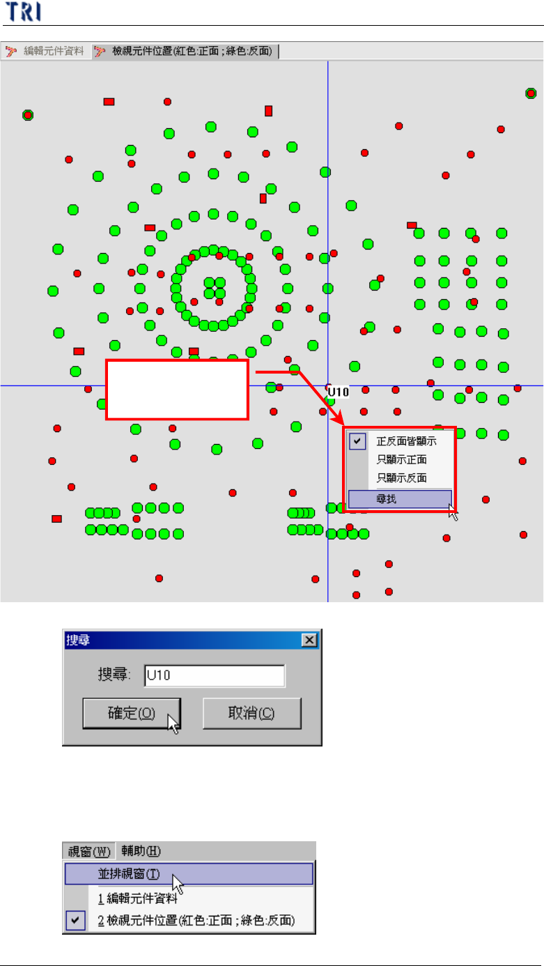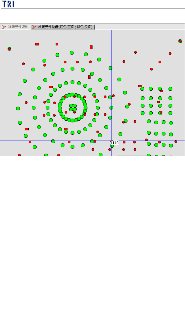 第 三 章、 A T PG 功 能 介紹 T R 7500 E 使用手冊 1 26 l 系統將根據座 標畫 出 各 元件 的 位置 n 紅色 標 示 表 示 位 於正 面 的 元件 , 綠 色 標 示 表 示 位 於 背 面 的 元件 ,方 塊 表 示 元件 已有 元件資料庫 , 圓 形表 示 此 元件 尚未 建立 元件資料庫 。 n 在 繪 圖 區 域 按 一 下滑鼠 右 鍵, 會 出 現 以下 工具 列 。 可以 選擇只 檢視 正 …