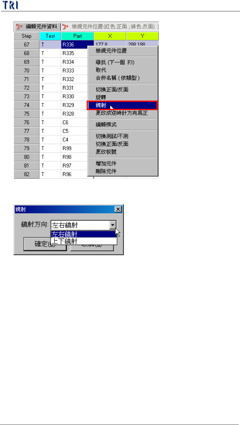第 三 章、 A T PG 功 能 介紹 T R 7500 E 使用手冊 1 36 逆 時針 順 時針 l 確 定 要更改請 按下 [ 是 ] 2 . 9 . 編輯 模 式 / 檢視 模 式 (E di t M od e / V i e w M od e ) l 若將 編輯元件資料 區 域 切 換 成 編輯 模 式 ,可 點 選 欲 更改 的欄 位 , 並 直接輸 入 資料作 更改 , 但 除 了 [ T e s t] 、 [ P a …
