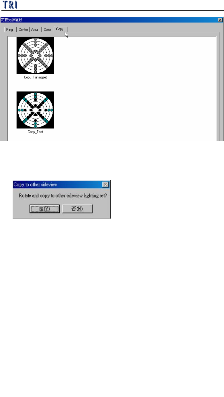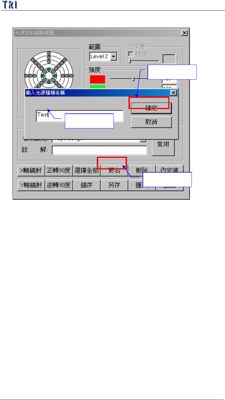 第 三 章、 A T PG 功 能 介紹 T R 7500 E 使用手冊 1 54 ( 1 4) 內 定 值 ( T y p e ) – 按下 後會 以 圖 示顯示 內 定 的 一些 燈 光設定 。 只 有在 第 ( 5) 點切 換 至 [ Al l] 時此按 鈕才 有 效 。 l 可 自 行 新 增 一 燈 光 且 將 燈 光 名稱 設定 為 “ 自 訂 名稱 1_ 自 訂 名稱 2 ” 則 在 此內 定 值 圖 示 將 會 新 增 …