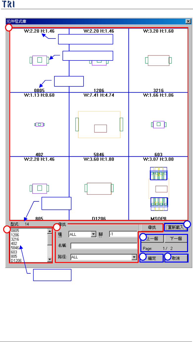 第 三 章、 A T PG 功 能 介紹 T R 7500 E 使用手冊 1 59 l 腳 – IC 腳 的 總 數 ,若 輸 入 [- 1] 表 示 不 限腳 數 全 部 尋找 。 l 名稱 – 輸 入 形 式 的名稱來 尋找資料庫檔案 。 l 路 徑 – 可 選擇 存 放 元件資料庫 的 路 徑,預 設 的存 放 位置 為 「 C : \ A O I \ P a c k a g e L i b r a ry 」 。 l 尋找 – 按…