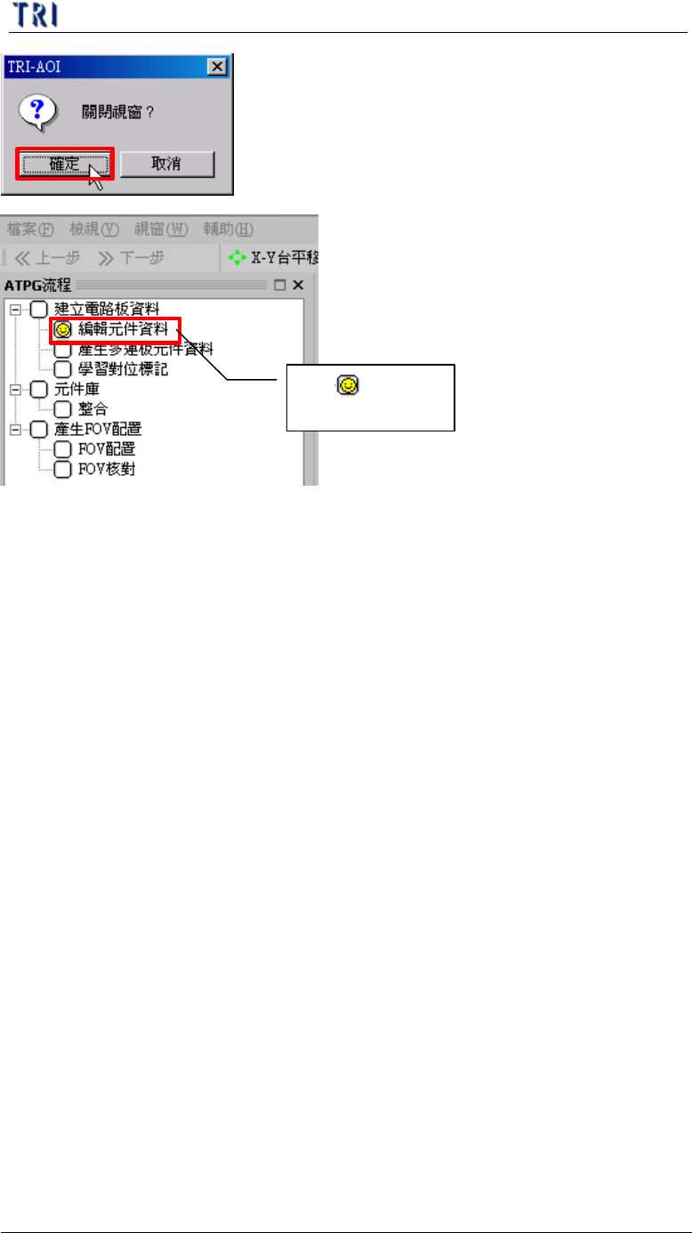 第 一 章 、 程 式製作 流程 T R 7500 E 使用手冊 10 ( 4) 確認 元件資料 無誤後 按 [ 下 一 步 ] 以 進 行 下 一 步驟 ( 5) 系統 會 出 現 是 否關閉 視窗對 話 框 ,按下 [ 確 定 ] 才 可 進 行 下 一 步 確認 元件位置 是 否正確 按下滑鼠 右 鍵可 幫 助尋 找元件位置
