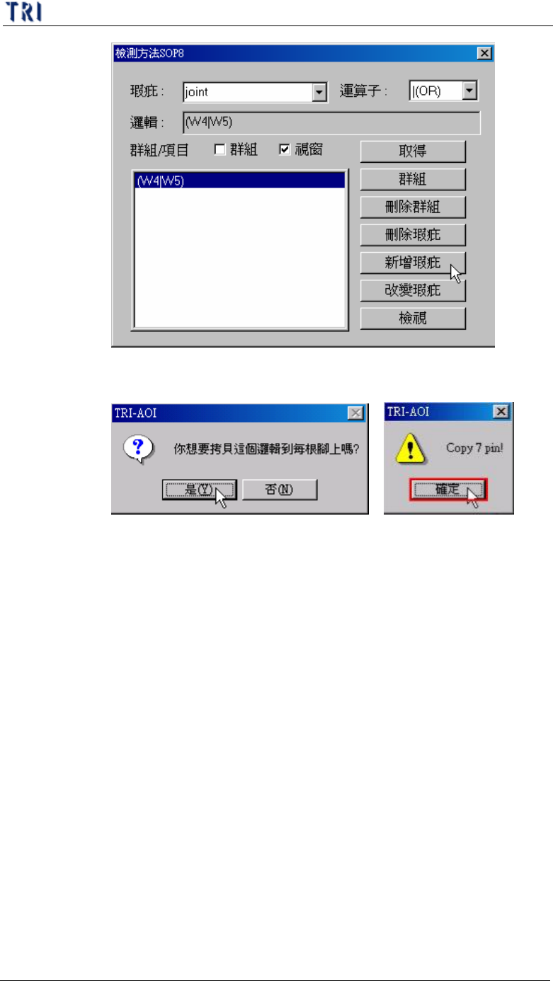 第 三 章、 A T PG 功 能 介紹 T R 7500 E 使用手冊 1 85 步驟 3. 在 列 表上 使用 滑鼠左鍵按 欲 設 為 邏 輯 的方 程式 兩 下 , 將此方 程式 列 在 [ 邏 輯 ] 欄 位 中 。 步驟 4. 給予 新 瑕疵 名稱 並 輸 入 在 [ 瑕疵 ] 欄 位 中 , 接著 按下 [ 新 增 瑕疵 ] 按 鈕 ,此 檢測 方 法即 設定 完成。