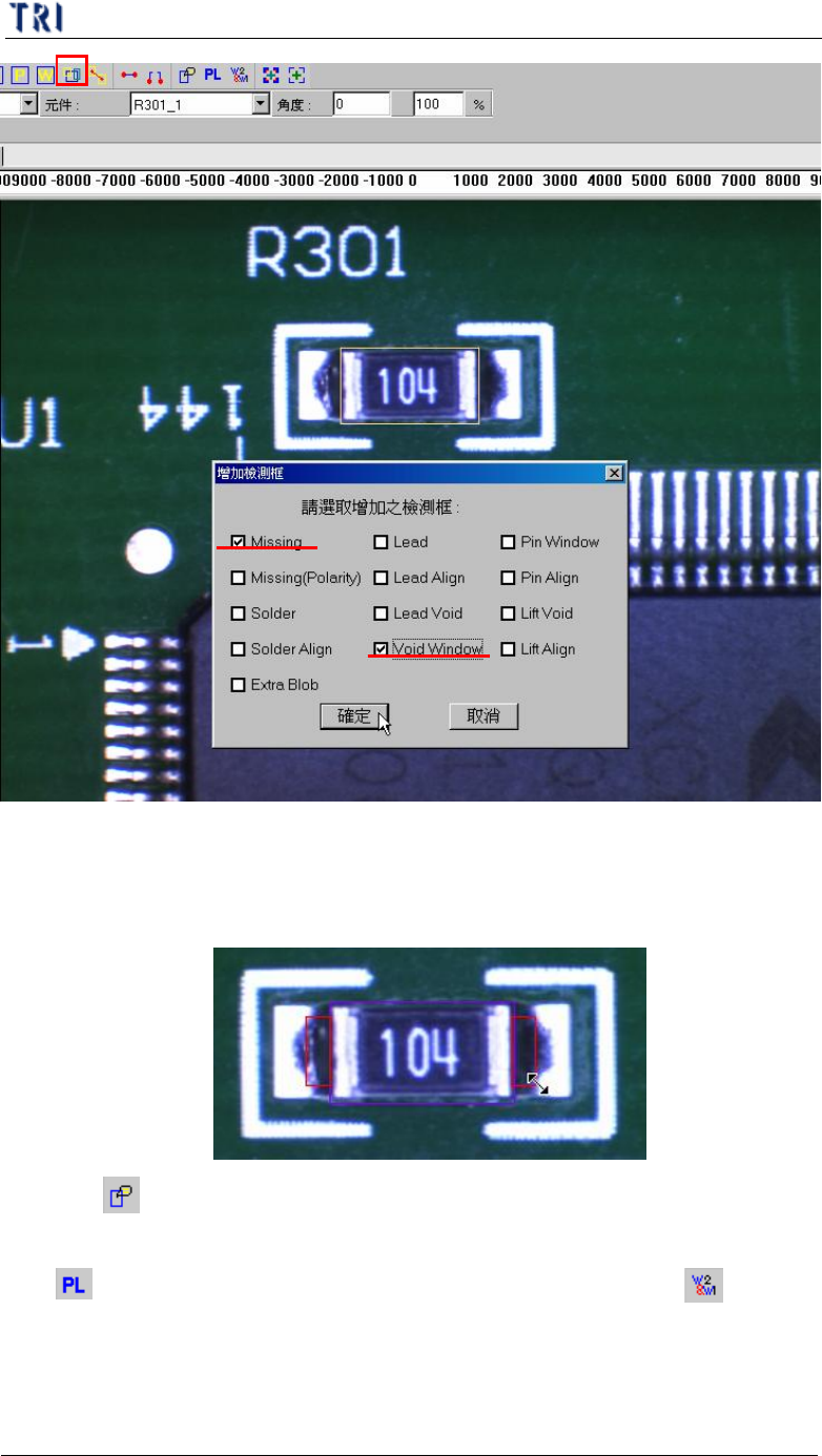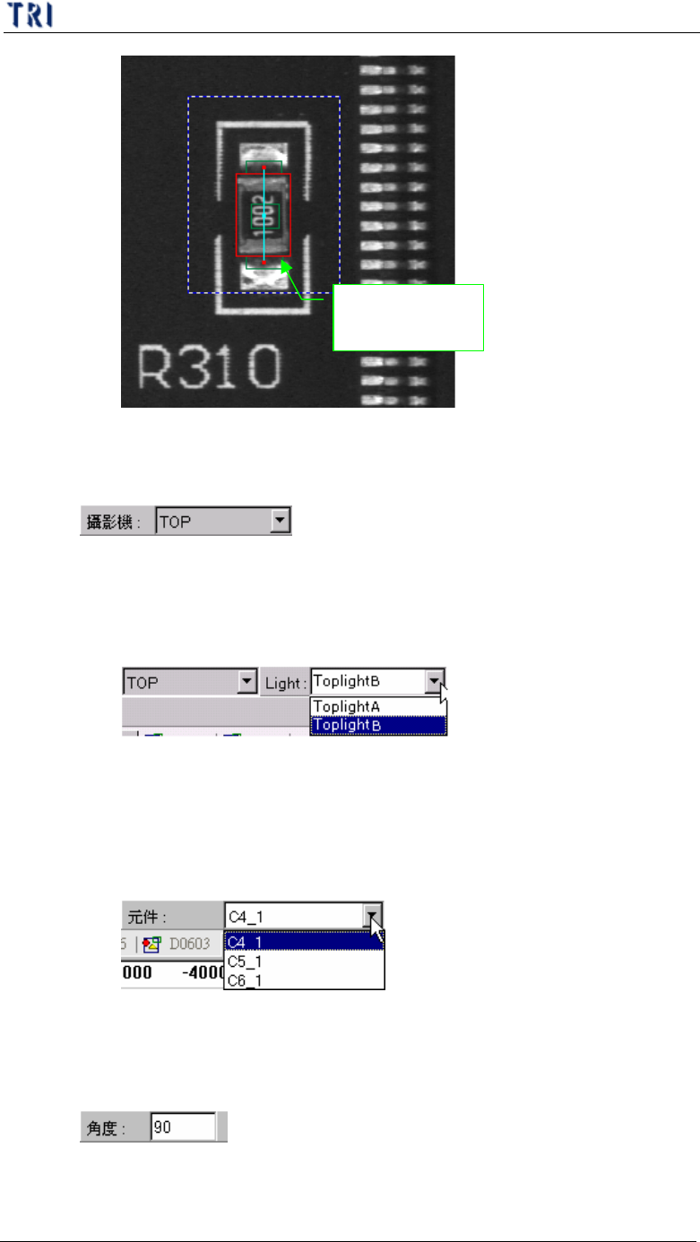 第 三 章、 A T PG 功 能 介紹 T R 7500 E 使用手冊 1 97 l 改變 百 分 比 可以將此 元件 之 所有 檢測框 依比 例 放 大 或 縮小 。 10 . 9 . 編輯 元 件資料庫 範 例 10.9.1. 例 1 – CH IP 類 ( 1) 選擇 標 準 元件 : 在 [ 元件 ] 下 拉 式 選單中選擇一顆 沒 有 偏 移 、 旋 轉 或 損傷 的 元 件 來 製作元件 。 ( 2) 調整元件本 體 框大…