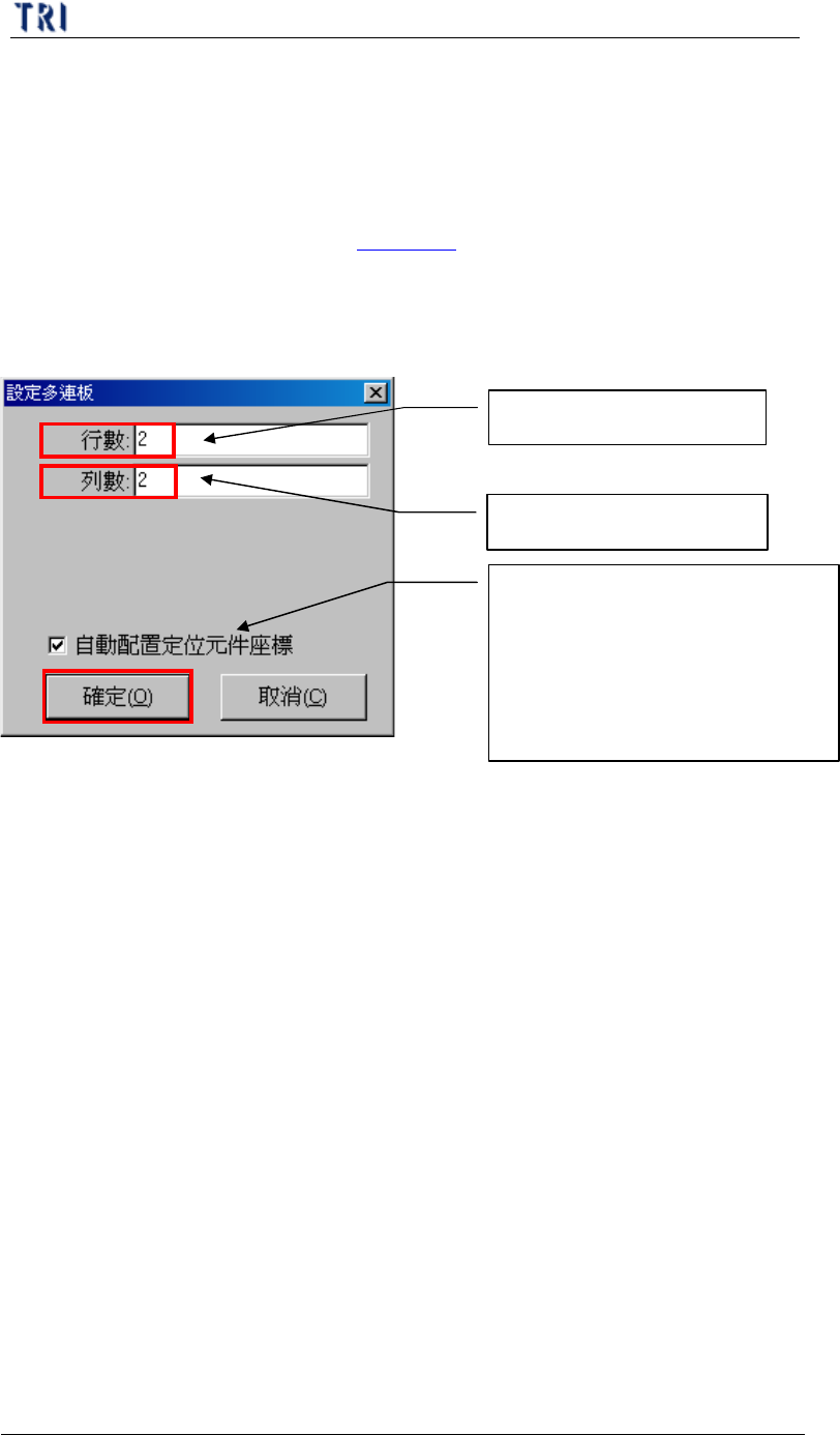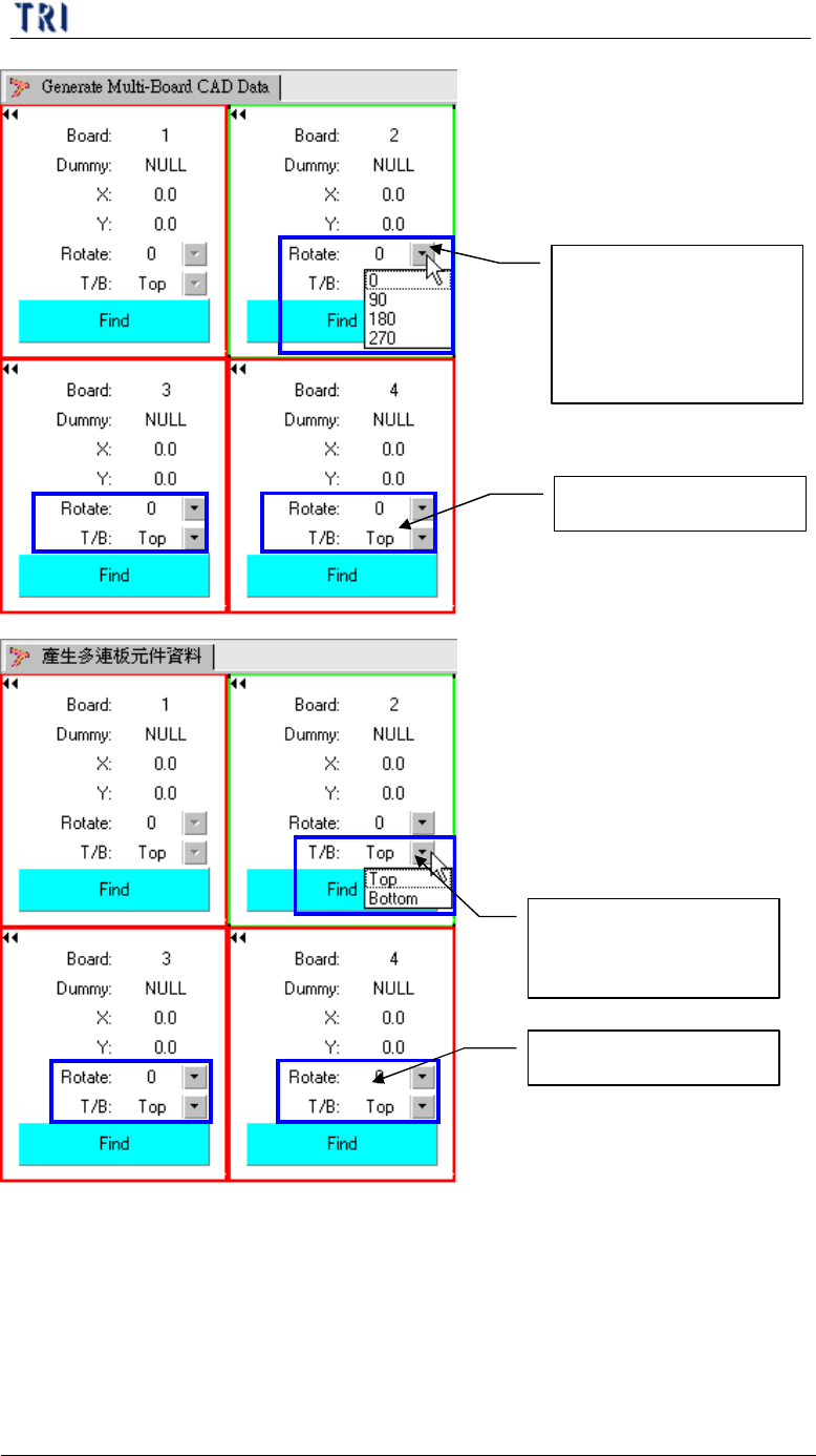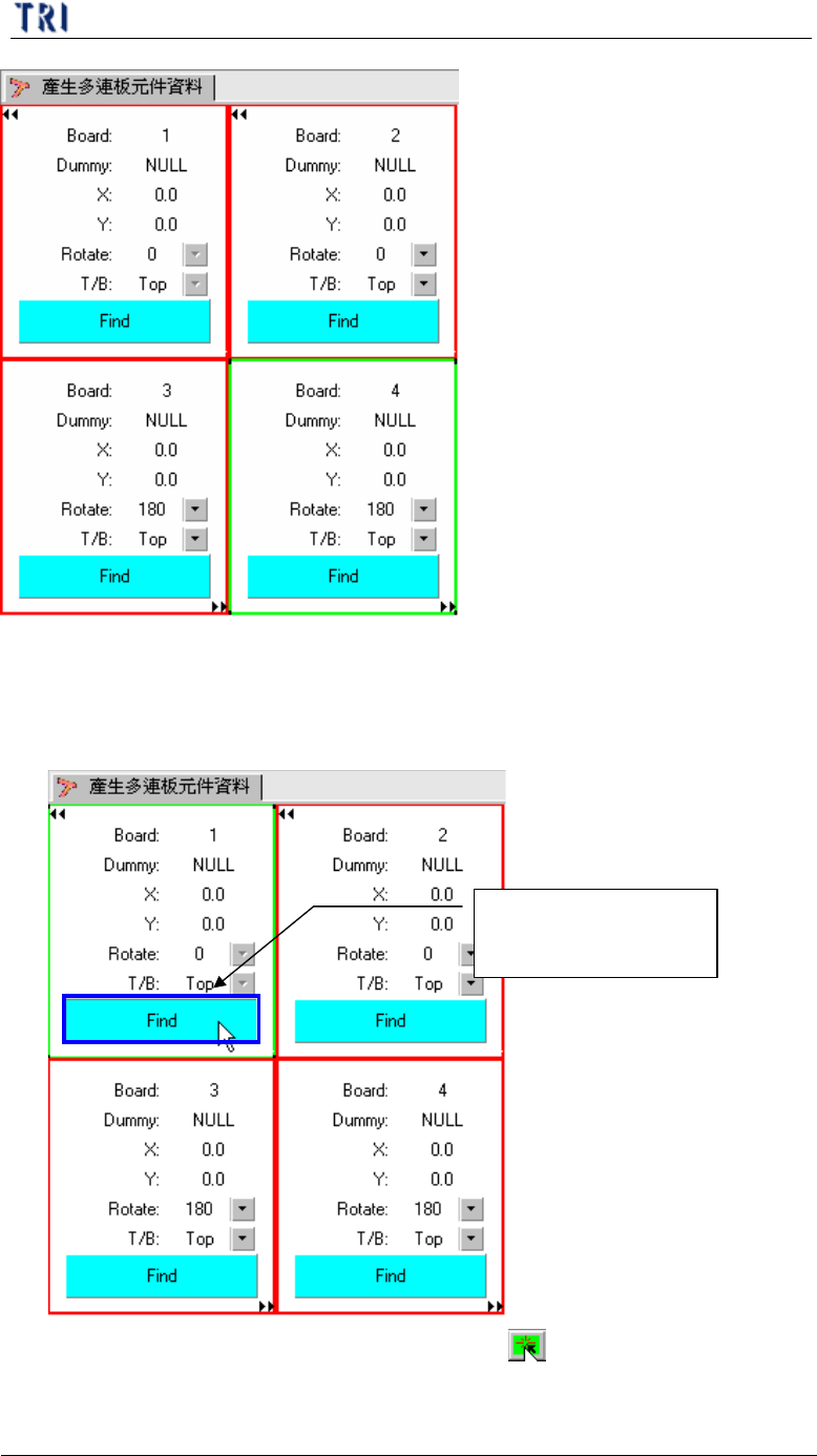 第 一 章 、 程 式製作 流程 T R 7500 E 使用手冊 13 ( 3) . 設定 完成 畫面 如 下 按下鍵 號 按 鈕 來 設定 此 片 板 子 的 旋 轉 角 度 ,有 0 、 90 、 1 80 、 2 70 度 四種選擇 其他 各 板 亦 需 設定 按下鍵 號 按 鈕 來 設定 此 片 板 子 的 正反 面 其他 各 板 亦 需 設定