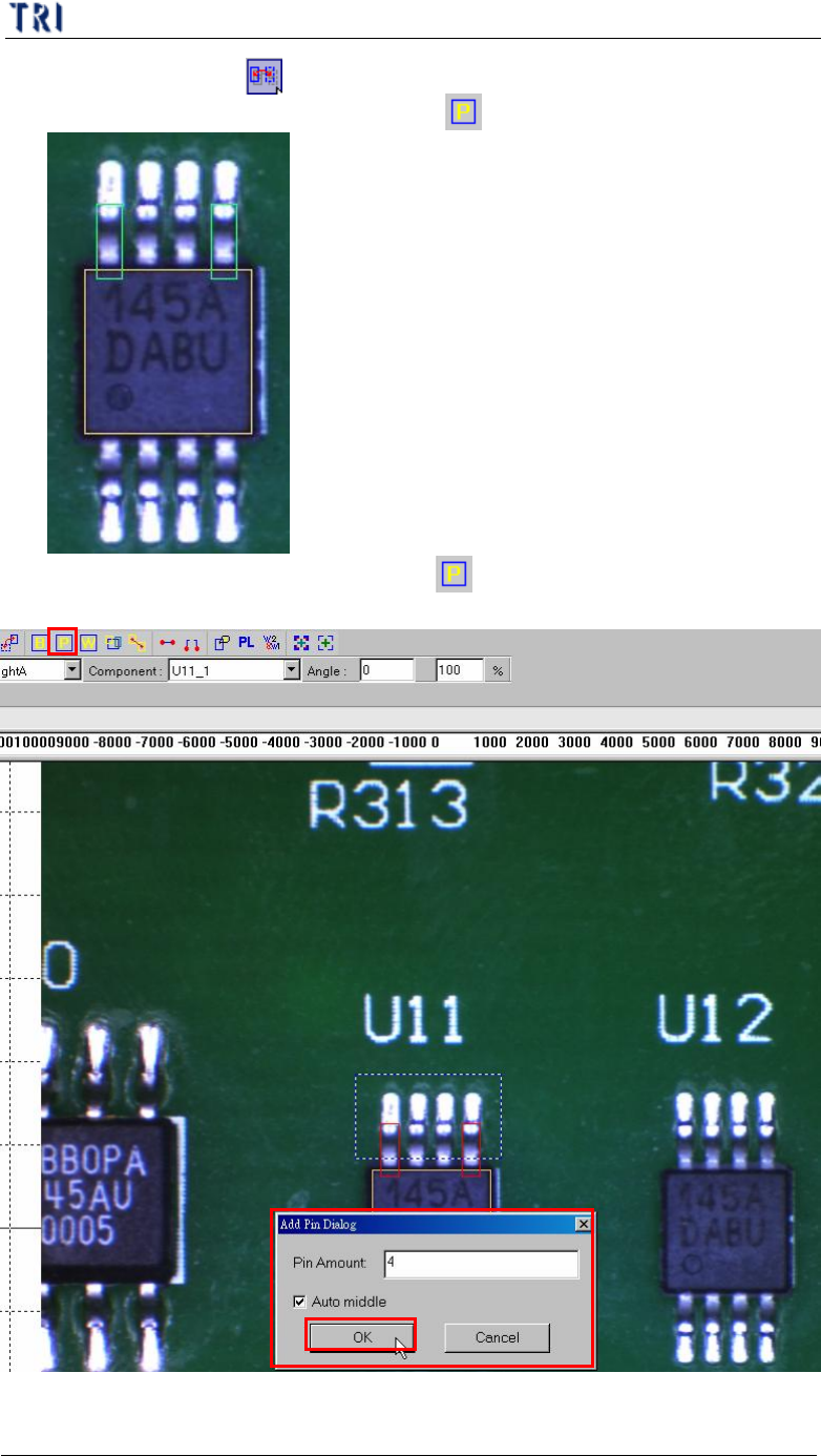 第 三 章、 A T PG 功 能 介紹 T R 7500 E 使用手冊 2 02 ( 3) 選擇 [ P i n] 框 後 按下 [ M i r r o r C o p y] 按 鈕 , 依 據 Y 軸 進 行 鏡 射 ,將此 箭 測框 對 應 Y 軸複 製 到 另 一 端 。 也 可以 使用 [ A dd P i n] 再 增 加 一 隻 腳 到 另 一 端 。 ( 4) 選擇 位 於 兩 端 的兩個 [ P i n] 框 後 ,按…