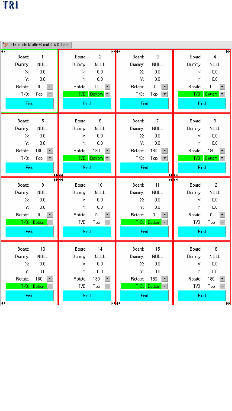 第 三 章、 A T PG 功 能 介紹 T R 7500 E 使用手冊 2 19 步驟 3. [ 產生多連板元件資料 ] – 製作多連版 時 要 選擇相 對 於 1 號 板 的 正反 面及 旋 轉 角度 。 步驟 4. 尋找定位元件 – 在 尋找 2 號 板及 4 號 板 的 定位元件 時,須以 位 於 該 板 正 面 的 元件 來 作定位 。 步驟 5. 產生多連板元件資料 後 , 可在 [ 檢視元件位置 ] 頁 面 查 看 正 面…
