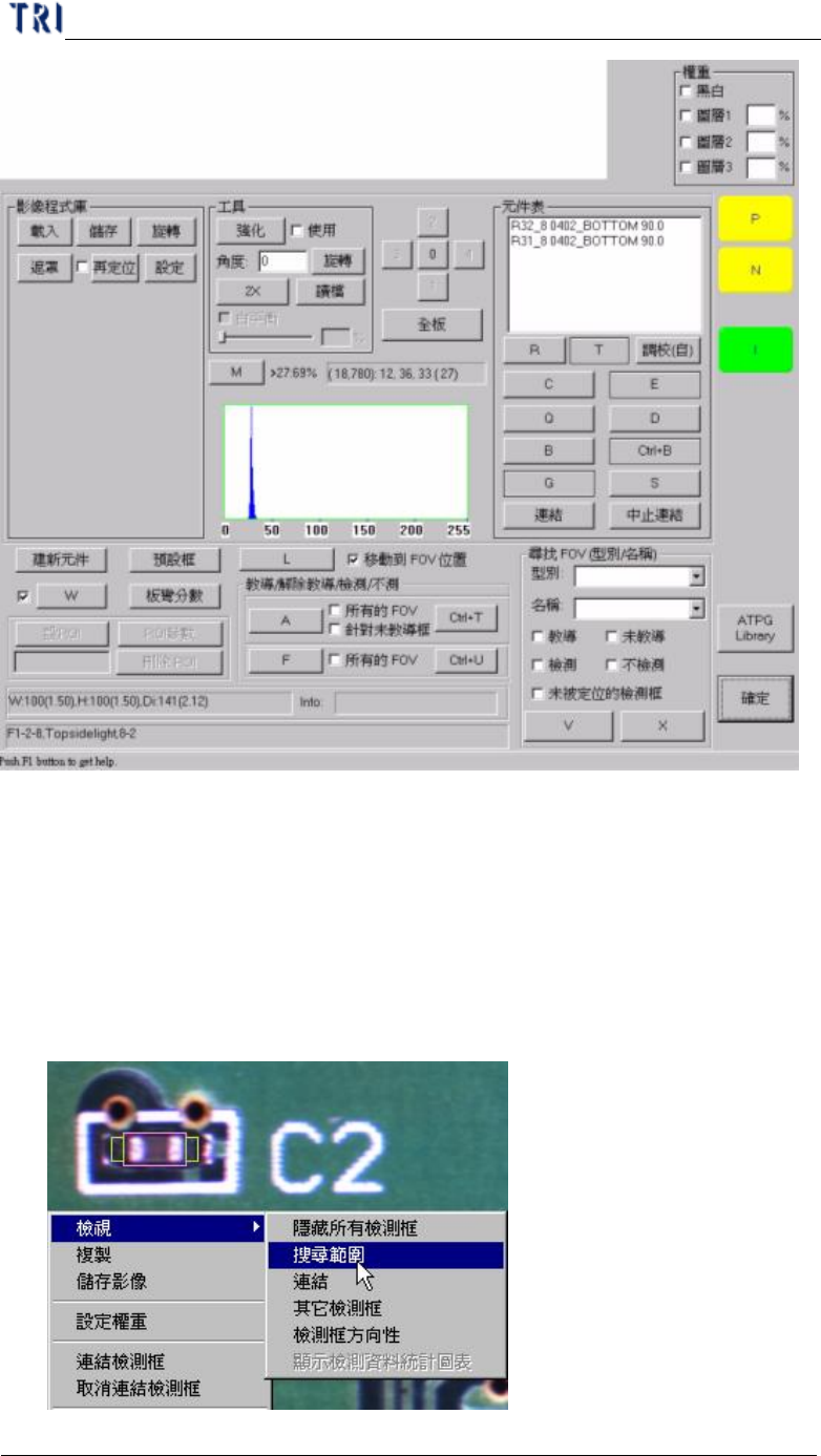 第 四 章、 Tr a in 視 窗 功 能 介紹 T R 7500 E 使用手冊 2 35 6 . 2 . 元件 表 ( C o m p o n e n t Li s t ) 6.2.1. 設 範圍 ( S e t R ng) l 改變 影 像 比 對 類型 檢測框 ( M i s s i n g / M i ss i ng P o l a r i t y / L e a d /A l i gn / W a r p) 的 搜 尋 範圍…