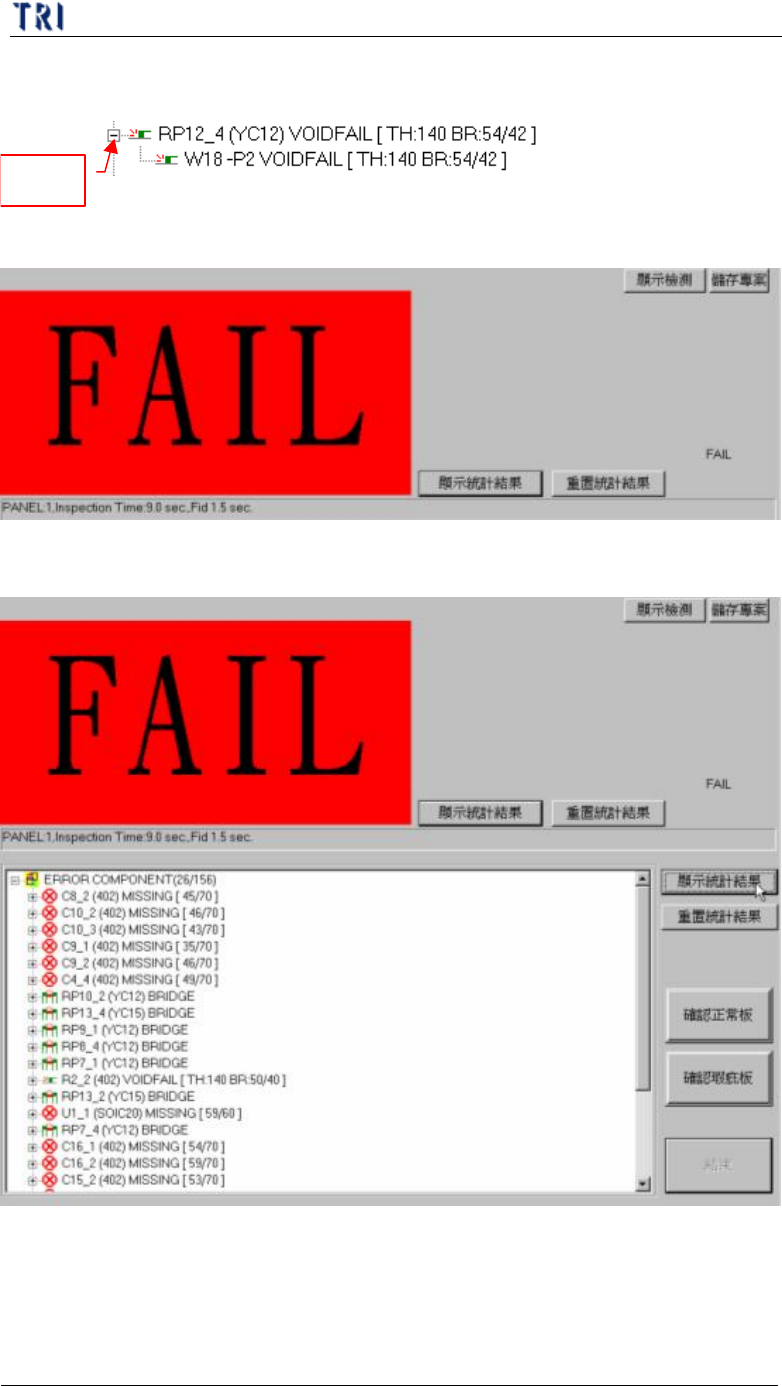 第 五 章 、 檢 測結果 視 窗 功 能介紹 T R 7500 E 使用手冊 2 68 元件 名稱 ( 類型 ) 瑕疵 種 類 [ 瑕疵 參數 檢測 分 數 / 檢 測 參數 ] 展 開 檢 測框 名稱 瑕疵 種 類 [ 瑕疵 參數 檢測 分 數 / 檢 測 參數 ] l 不 顯示 統 計 結 果 ( D i s a b l e Y i e l d C ou n t ) – 不 顯示 出統 計 結 果 欄 位 l 重 置 統 計 結 …