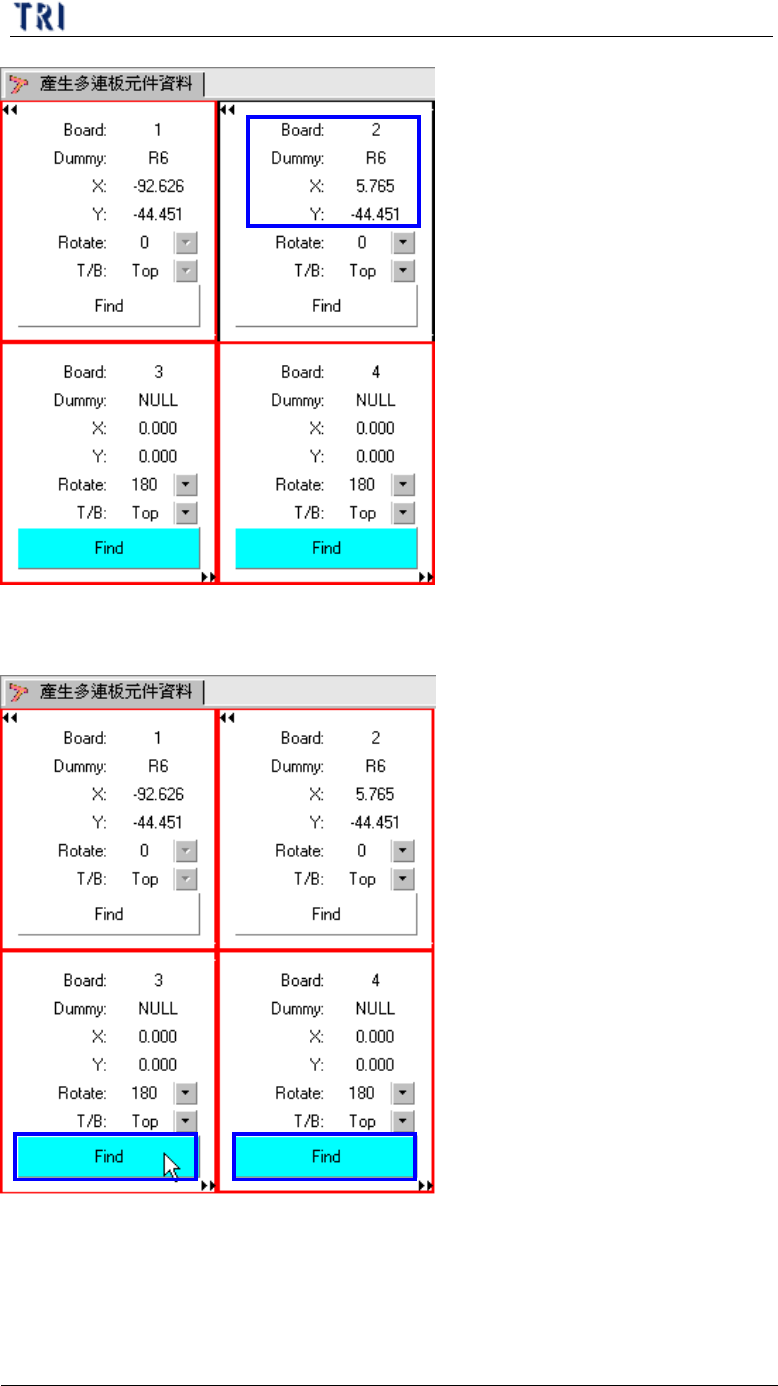 第 一 章 、 程 式製作 流程 T R 7500 E 使用手冊 27 ( 1 1) 出 現 視窗 顯示 2 號 板 的 定位元件 座 標 , 請 按 [ 確 定 ] ( 1 2) 系統回 到 [ 產生多連板元件資料 ] 頁籤 , 並 顯示 出 2 號 板 已完成的 相關 資料 再 按下此按 鈕 取得 元件 座 標 首 先 移 動攝影 機 至 元件 中 心 位置