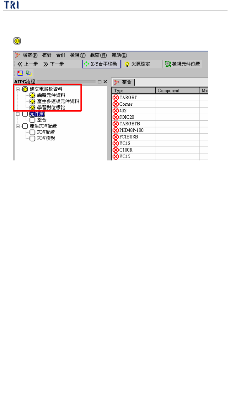 第 一 章 、 程 式製作 流程 T R 7500 E 使用手冊 42 ( 6) [ 建立 電路板元件資料 ] 之 所有步驟已 經 完 成, 畫面 上 也 已將完成 之 步驟 畫 上 作記 號 。 6 . 編輯 元 件 資料庫 (L i br a ry) l 此步驟是 針 對 不 同 封 裝類型 ( T y p e) 的 元件 , 建 立其 專屬 的 資料庫 ,其內容 包 跨 產生 所需的 檢測 框、 安 排 檢測框 的 大 小 及位 …