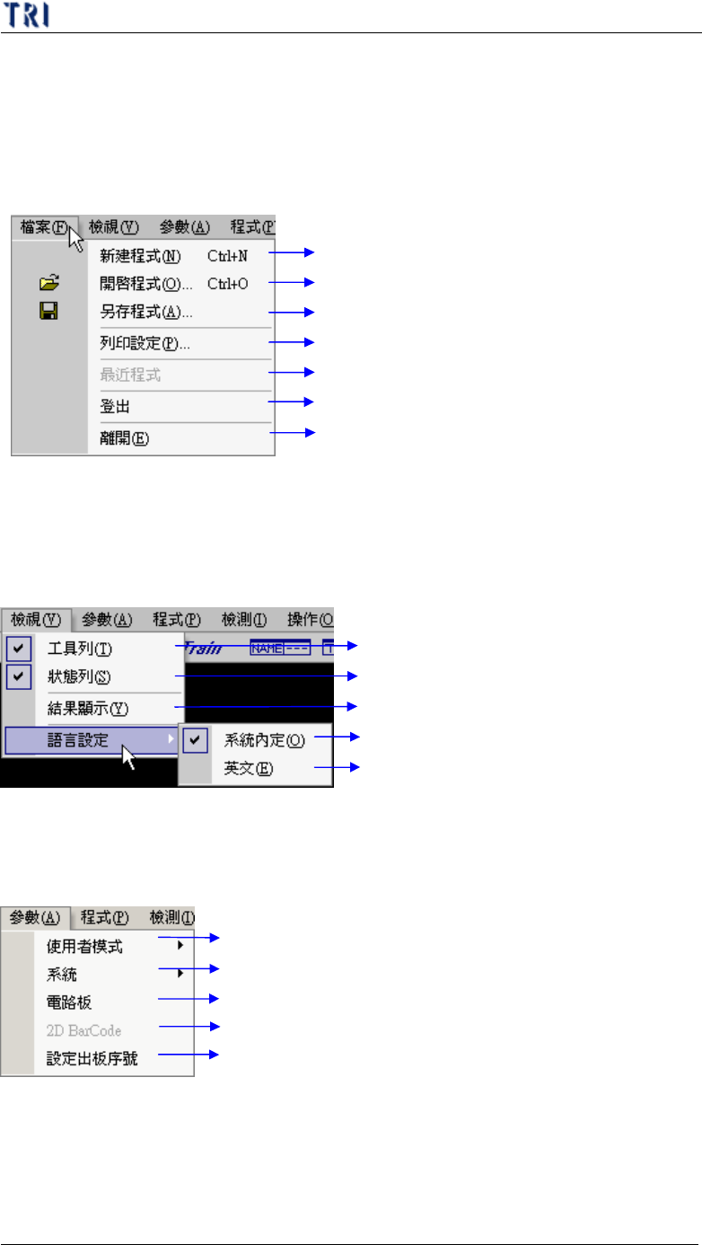 第 二 章、主 程 式 選 單介紹 T R 7500 E 使用手冊 58 第 二章 、 主 程 式 選 單 介紹 1 . 檔案 ( F il e ) 建立 一 個 新 的 程式 開啟 一 個已存在的 程式 將 目前開啟 的 程式 以其他名稱 或 路 徑 另 存 新檔 設定 印 表機 最 近 開啟 的 程式 登 出 目前 的 使用 者 關閉 程式 2 . 檢視 ( V ie w ) 勾選 表 示 開啟工具 列 表 勾選 表 示顯示 狀 態…