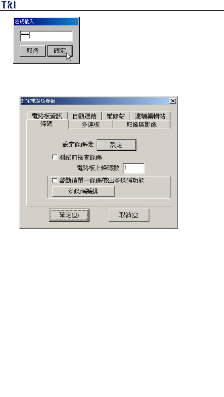 第 二 章、主 程 式 選 單介紹 T R 7500 E 使用手冊 62 l 多 條碼 編 排 ( M u l t i B a r c o d e L a y o u t ) – 若在 [ 電 路板 上條碼 數 ] 的 值 大 於 1 ,按 下此按 鈕 可以 進入 條碼 編 排 的 畫面 。 n 進板 方向 ( P a n e l i n p u t d i r ec t i o n ) – 設定進板 方 向為 從 左 進 或 從 右 …