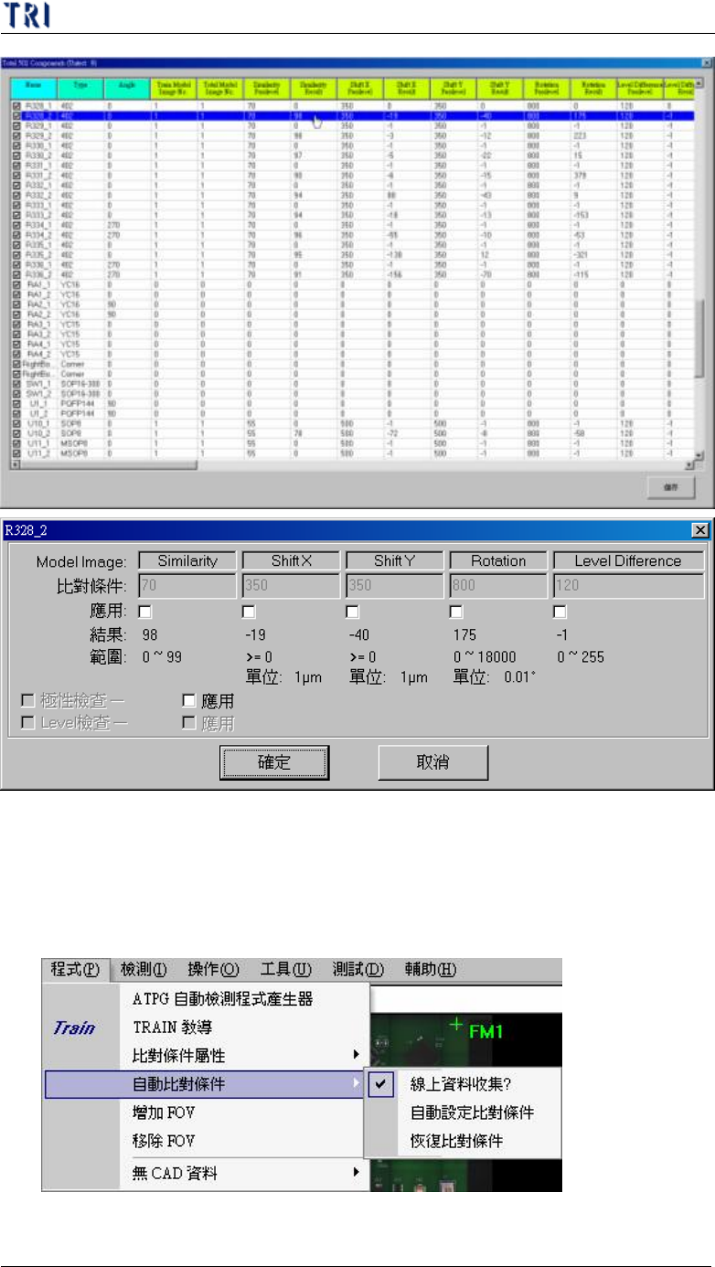 第 二 章、主 程 式 選 單介紹 T R 7500 E 使用手冊 75 4 . 4 . 自動 比 對條件 ( A u t o P as s L e ve l ) 4.4.1. 線 上 資料收集 ( I n l i n e D a t a C o llec t i on ) l 打勾 表 開啟 線上 資料 收集 , 系統將 開 始 收集 檢測資料 , 做 為 自動 比 對 條 件 的 依 據 , 系統 僅 儲存 最 近 30 筆 的 資…