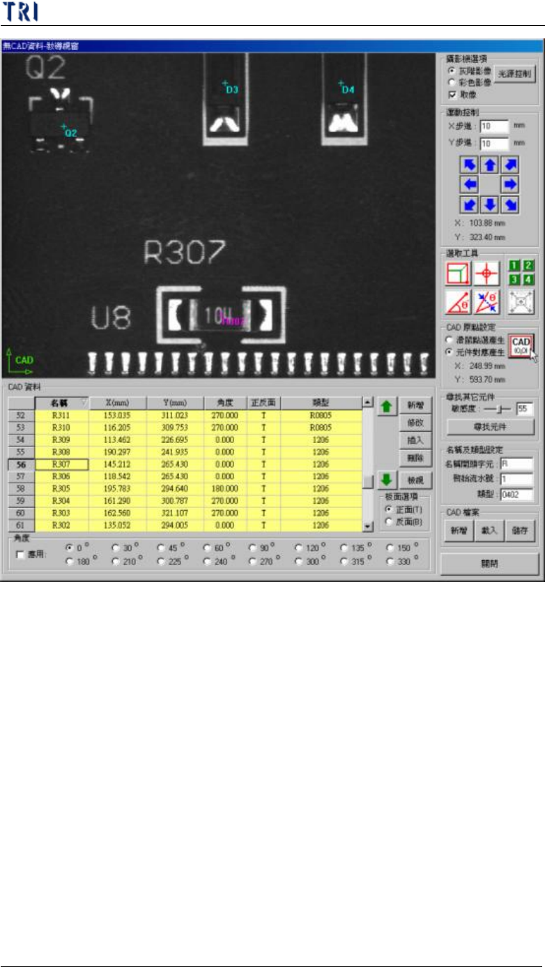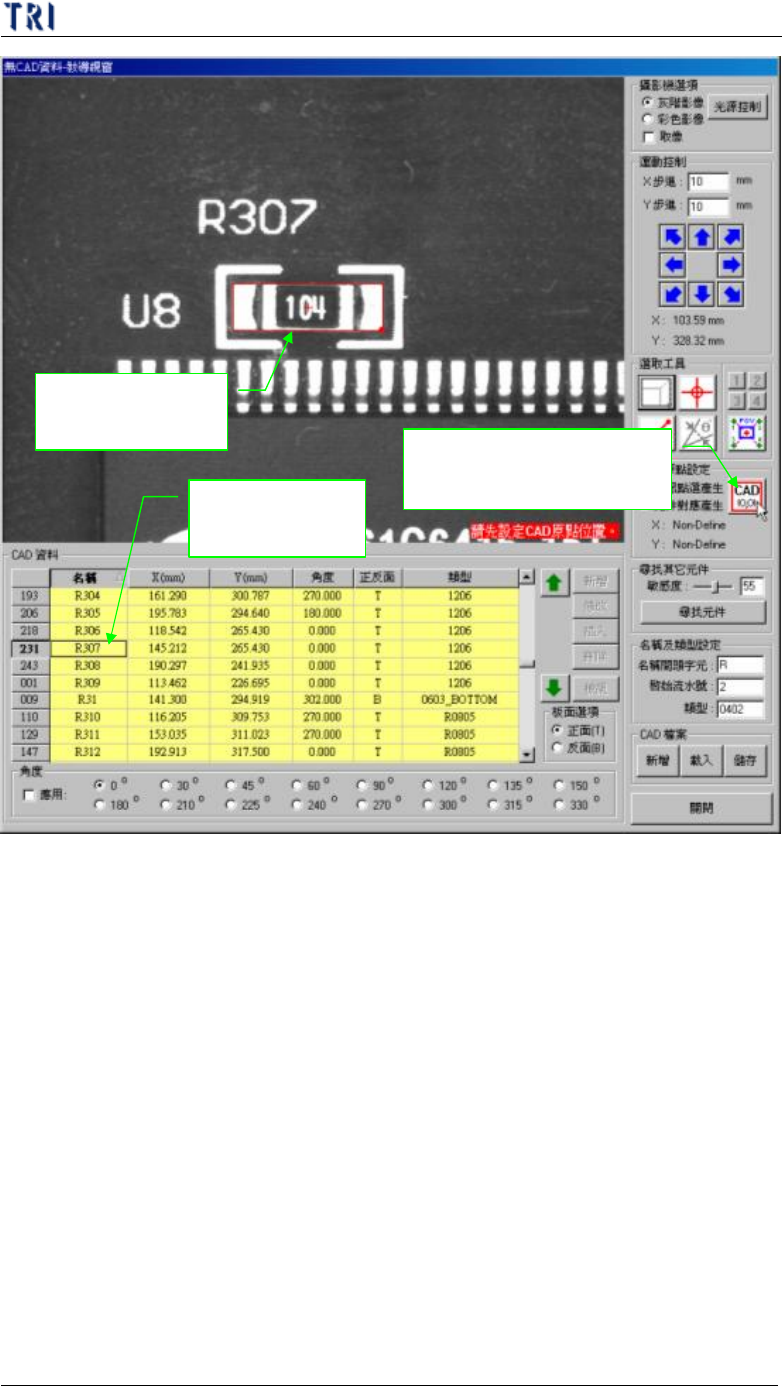 找出其中心位置,接著按下[CAD(0,0)],系統即會標示出所有已經存在 AOI