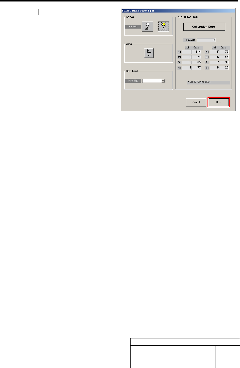 Fixed Camera Upper Li ght Calibration HLF-10305-01 Fixed Camera Upper Light Calibration SHEET 2/3 2 Select jig No. of fixed camera light calibration jig from the list box. 3 Click the Calibration S tart button. “Install …