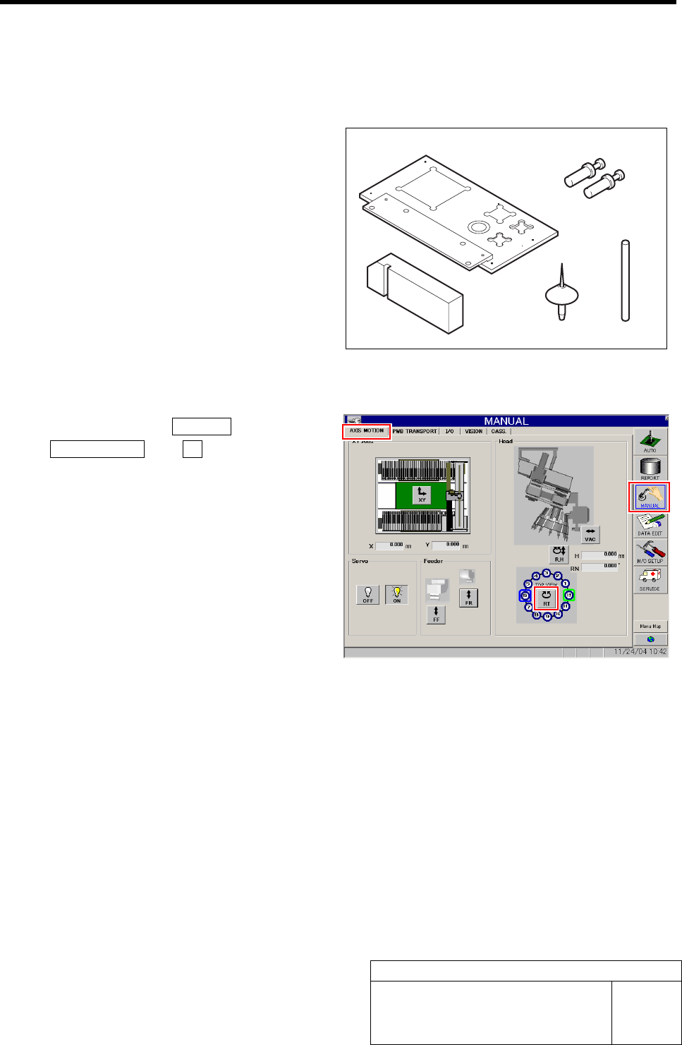 RT Axis Origin Position Set up HLF-10201-01 RT A xis Origin Position Setup SHEET 1/5 R T Axis Origin Position Setup [Necessary jigs] A Calibration plate jig B Jig positioning pin C Nozzle jig (AF06040) D RT jig shaft E R…