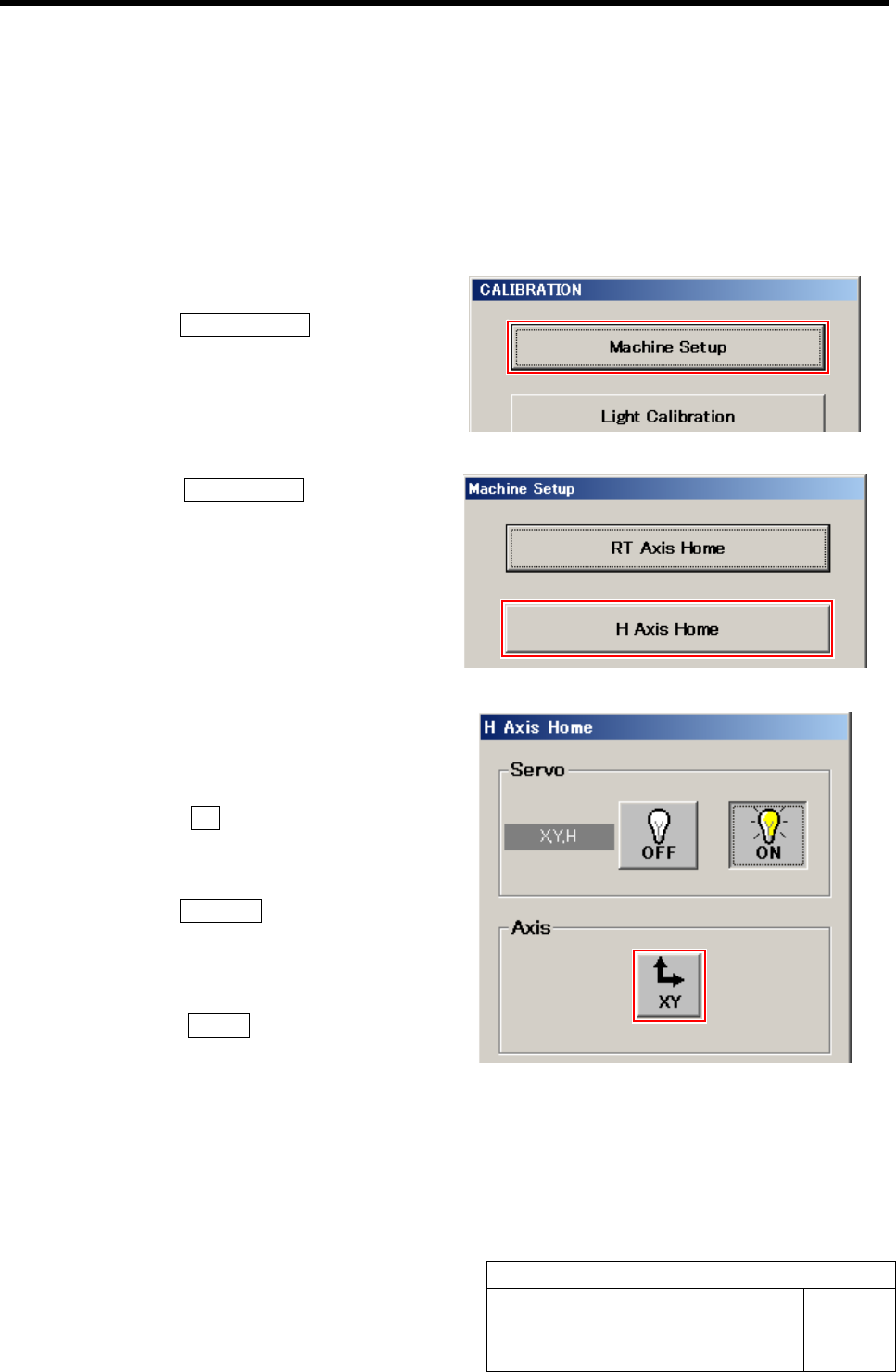 H Axis Origin Position Setup HLF-10202-01 H A xis Origin Position Setup SHEET 1/2 H Axis Origin Position Setup [Necessary jigs] • Do not use jig. [Procedure] 1 Display H Axis Home screen. 1. Click the Machine Setup butto…