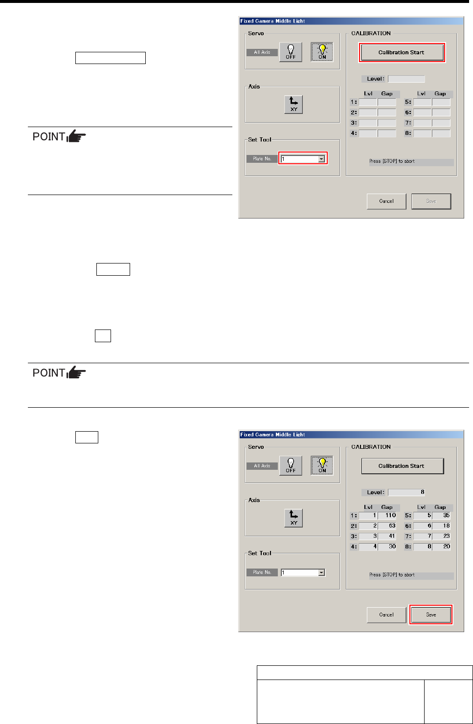 Fixed Camera Middl e Light Calibration HLF-10306-01 Fixed Camera Middle Li ght Calibration SHEET 2/2 2 Select jig No. of fixed camera light calibration jig from the list box. 3 Click the Calibration S tart button. “Insta…
