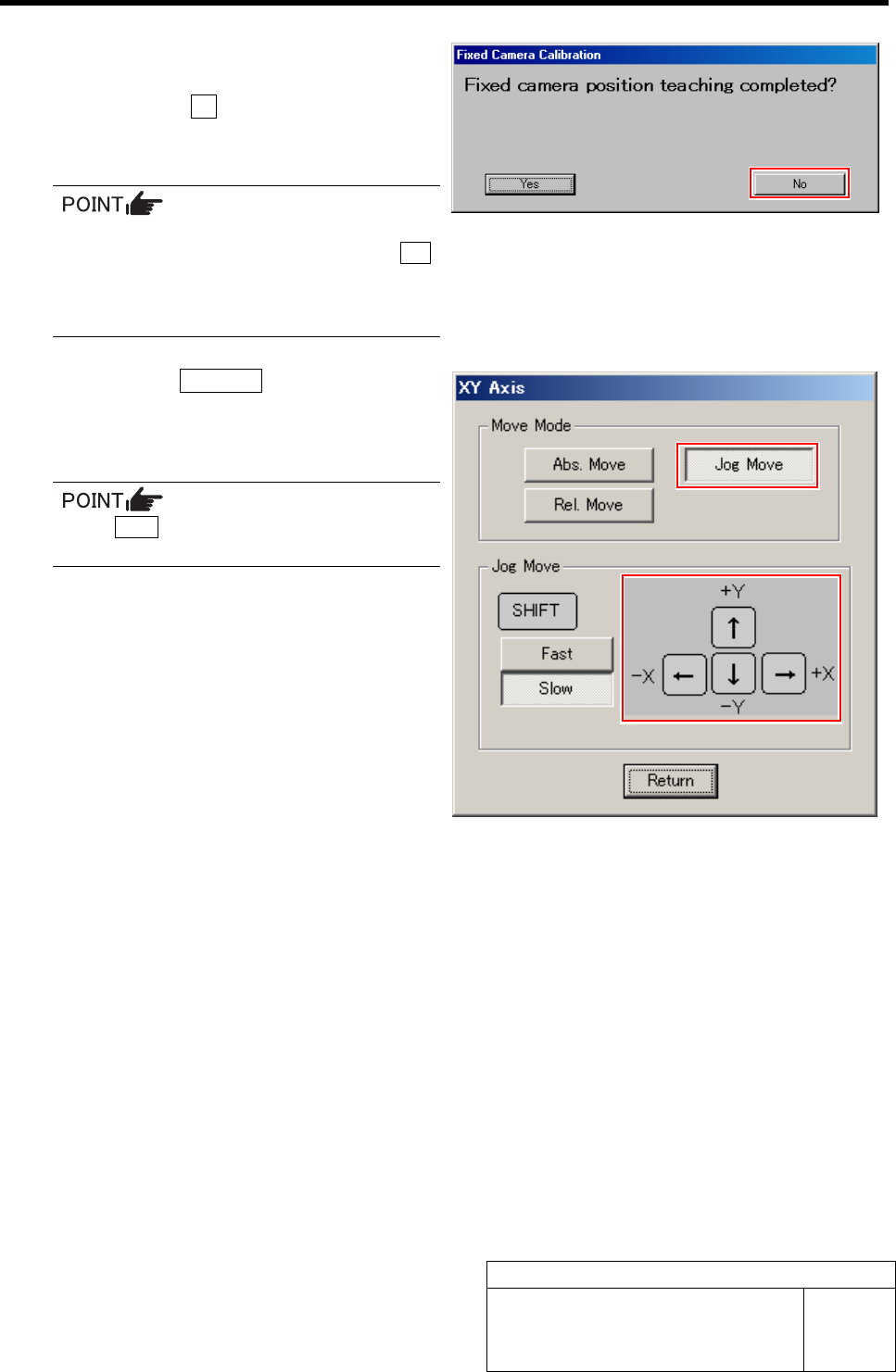 Fixed Camera Cali bration HLF-10313-01 Fixed Camera Calibration SHEET 3/7 7 Jog move the fixed camera jig 1 picked up by the nozzle jig onto the fixed camera. 1. Press the No button on the message screen. XY Axis screen …