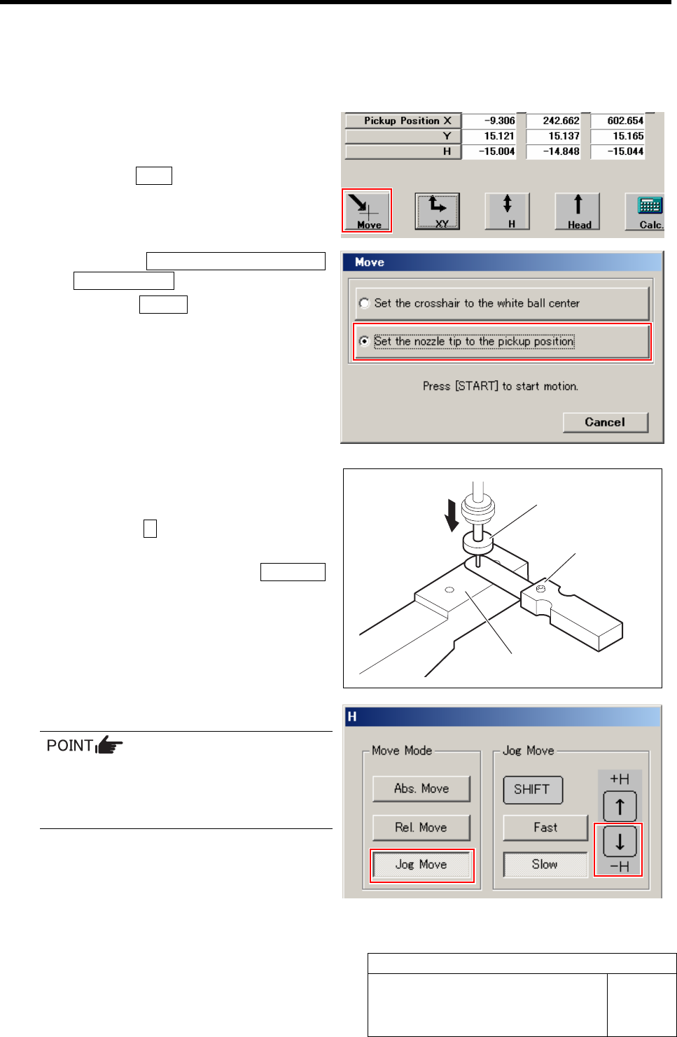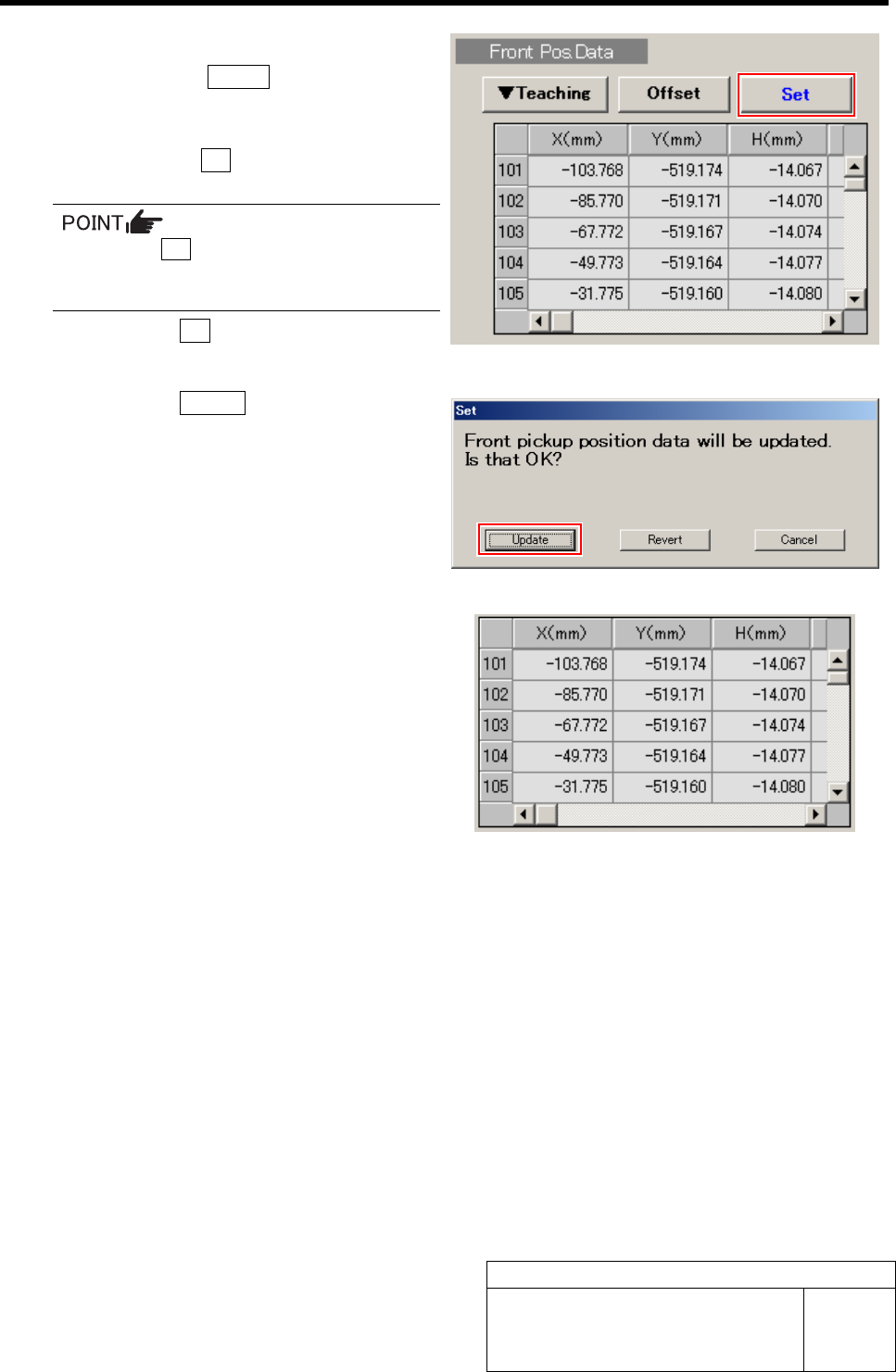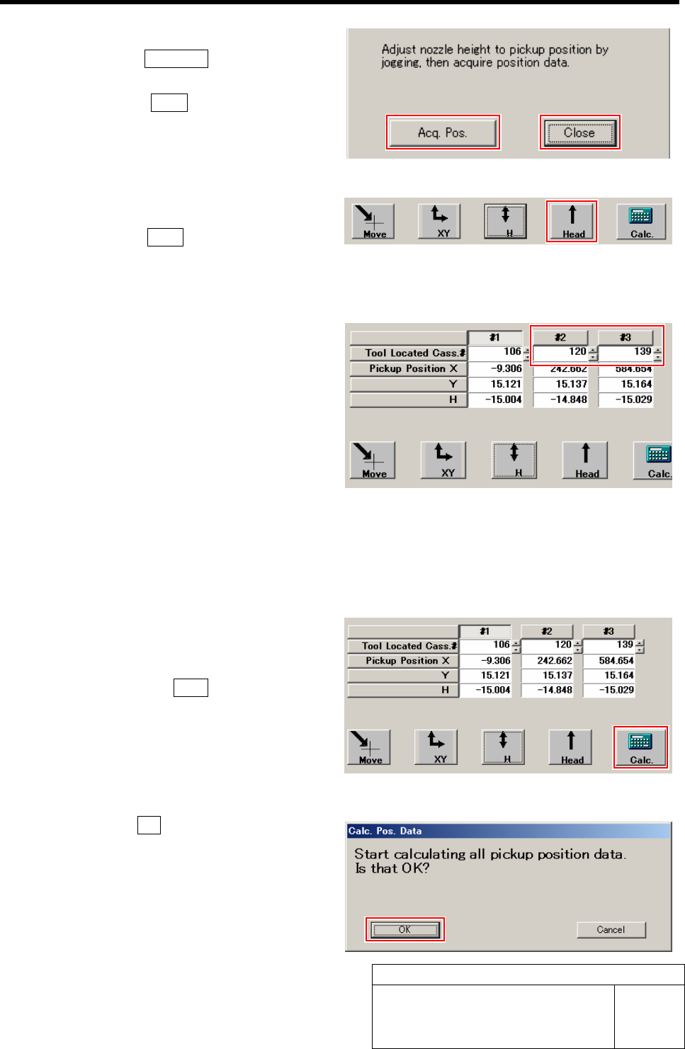 Pickup Position Setup HLF-10314-01 Pickup Position Setup SHEET 6/7 3 Acquire the H position afte r positioning. 1. Click the Acq. Pos. button on the H screen to acquire H positi on of Z106. 2. Click the Close button to c…