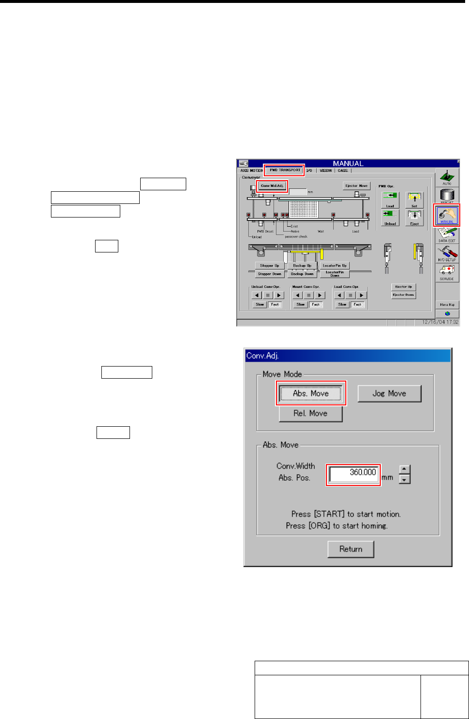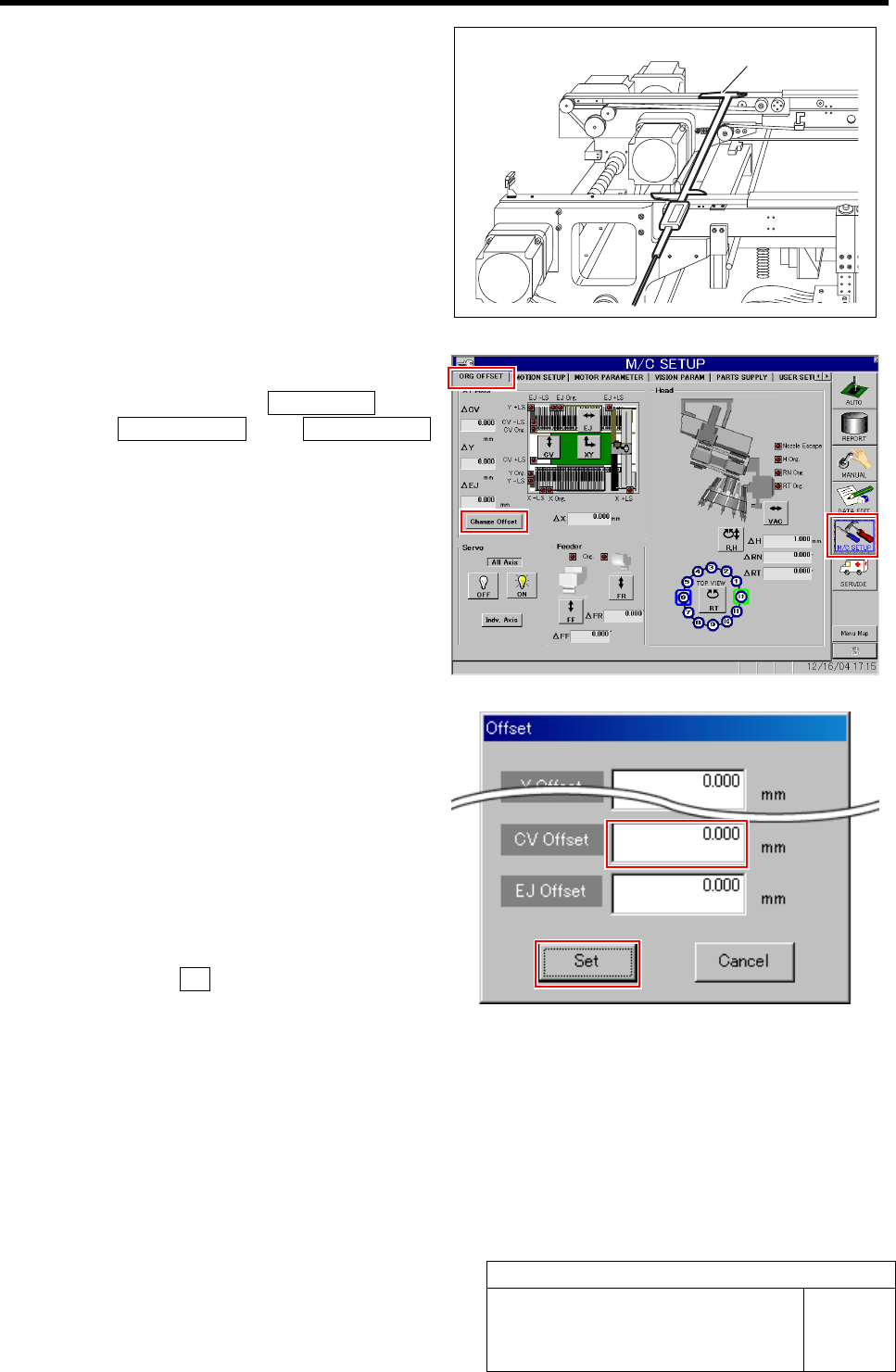 Conveyor Width Adjustment HLF-10316-01 Conv eyor Wid th Adju stmen t SHEET 2/2 3 Measure the conveyor widt h with digital slide calipers. 4 Display Offse t screen. 1. Click in an order of M/C SETUP menu Î ORG OFFSET tab …
