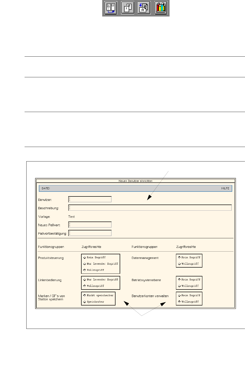 3 Desktop (Stammfenster) Betri ebsanleitung Linienrechner UNIX 3.2 Bedienoberfläche Desktop Softwareversion 503.xx Ausgabe 02/2002 108 I t I I Konto für einen neuen Benutze r einrichten ● Im Anzeigeber eich des D ialogfe…