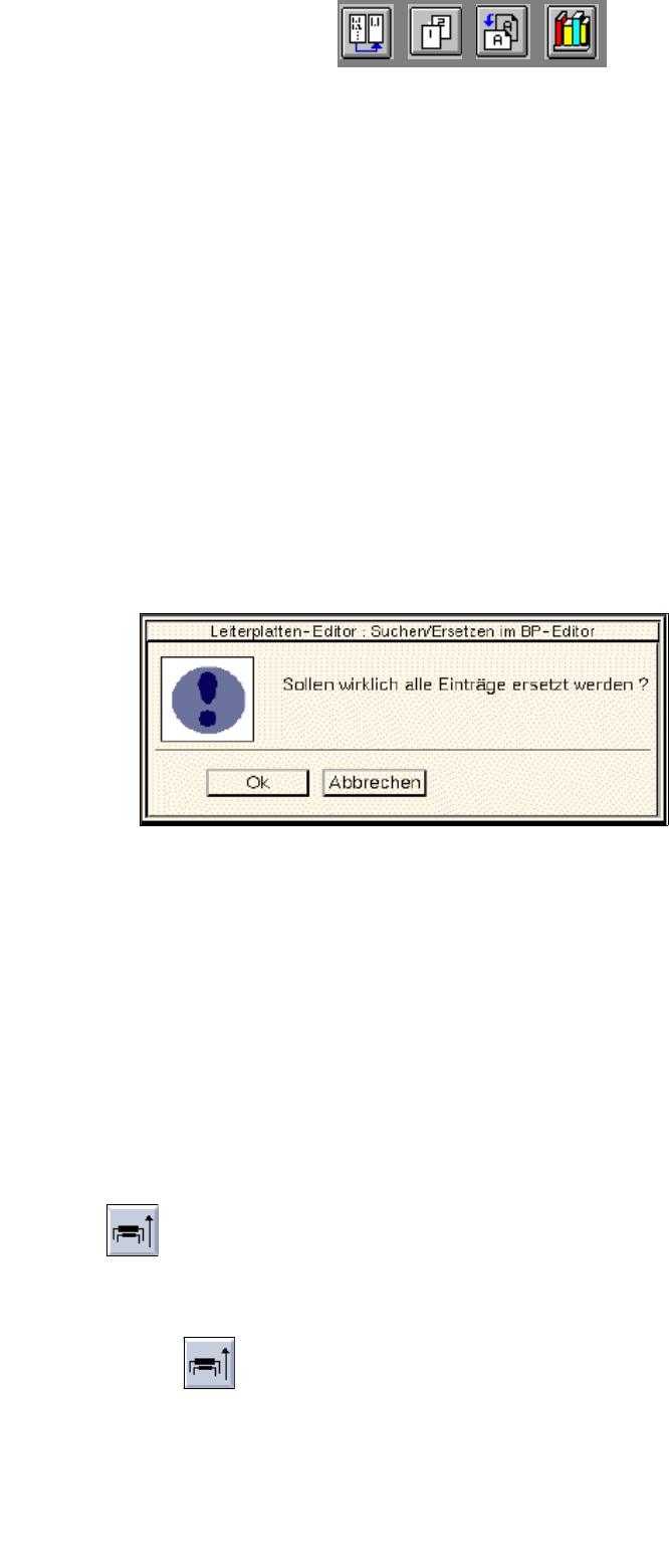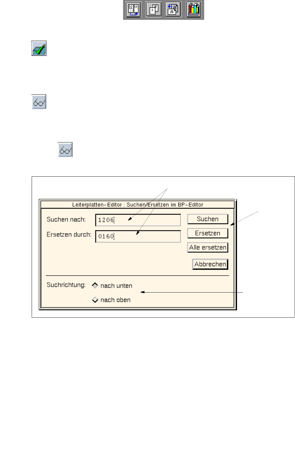 Betriebsanleitung Linienrechner UNIX 8 Produkt / Leiterplatte Softwareversion 503.xx Aus gabe 02/2002 8.1 Leiterplatten-Editor 287 I t I I Vorgehensweise für Suchen und Ersetze n von Zeichenfolgen ● Button mit de r gewün…