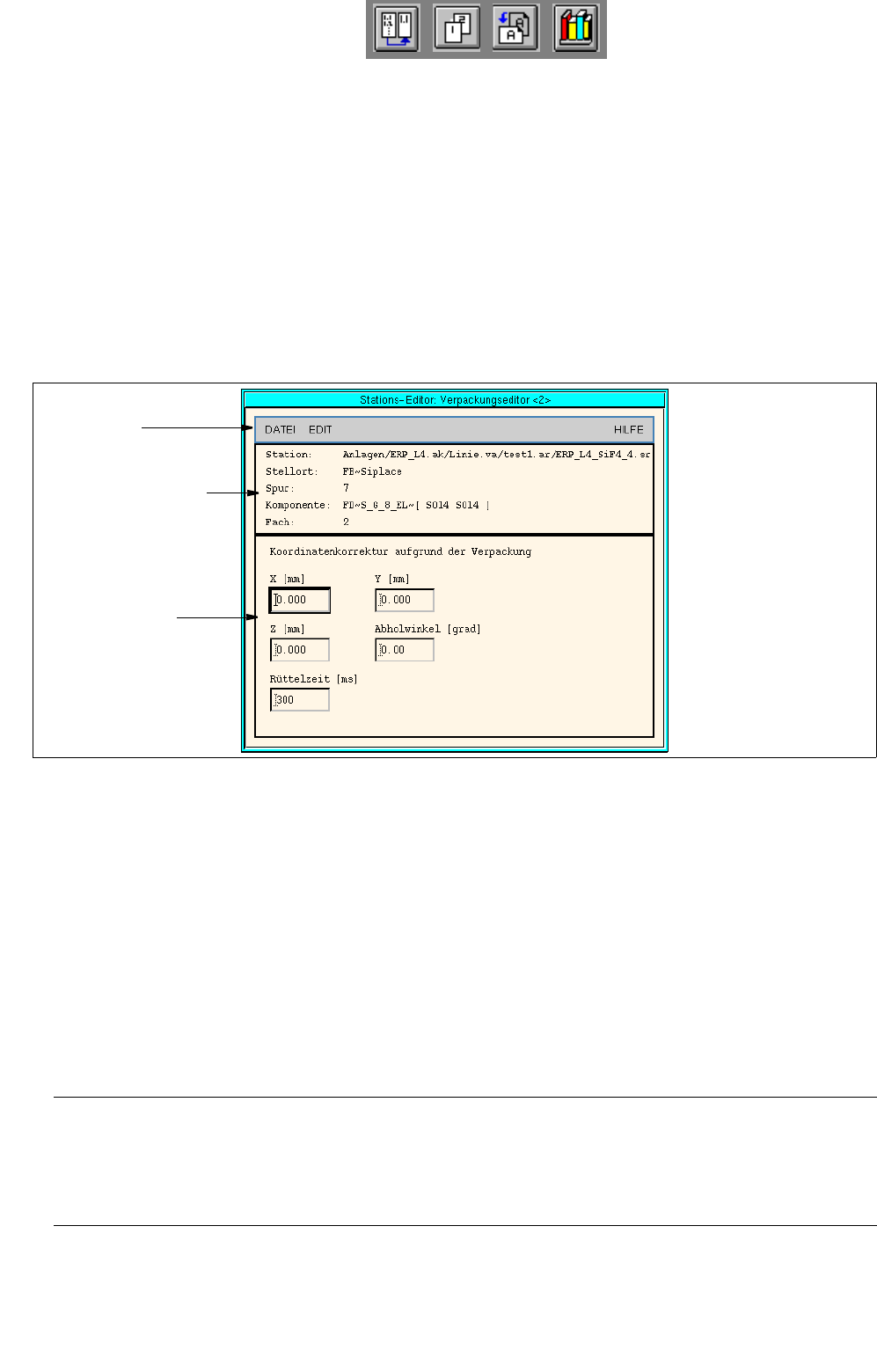 Betriebsanleitung Linienrechner UNIX 13 Produktionsmittel / Rüstu ng Softwareversion 503.xx Ausgabe 02/2002 13.1 Rüst -Editor (Förderbereichs- und WPW/MTC-Editor) 413 I t I I 13.1.3.3 V erp ackungsbox/V erp ackungseditor…