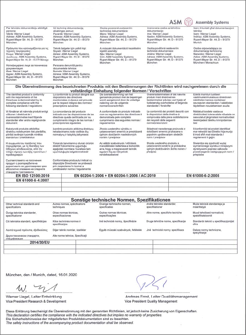 8 Anhang Betriebsanleitung SIPLACE SX1/SX2 Edition V2 und V3 8.1 EG-Konformitätserklärungen Ab Softwareversion SR.713.1 Ausgabe 12/2020 346 8.1.1.2 SIPLACE SX2 (520502) 8 Abb. 8.1 - 3 SIPLACE SX2 (520502) - Seite 1
