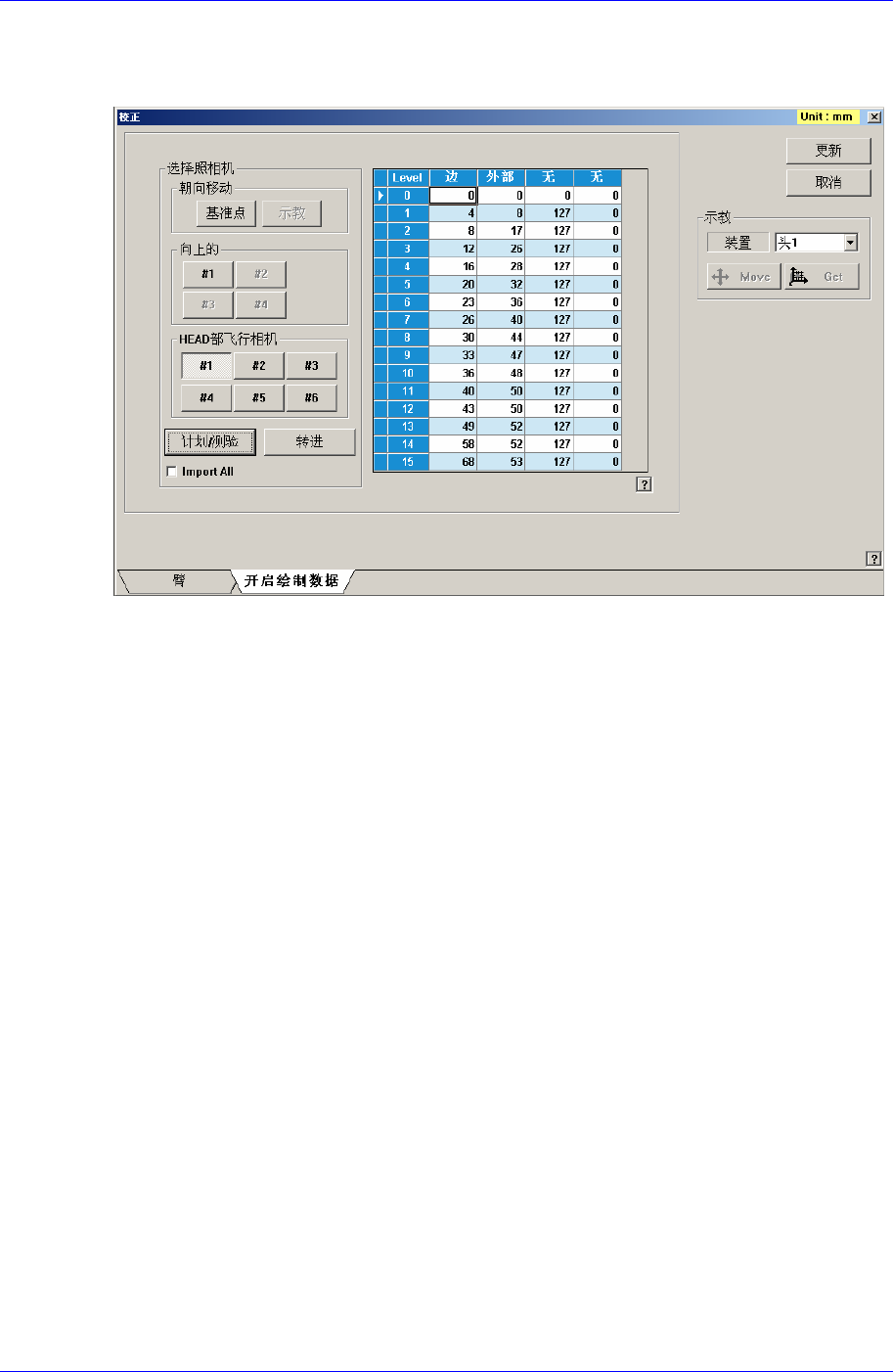 à Fiducial, Teaching Camera时: Inner 照明输入成256阶段值。 (Head Move