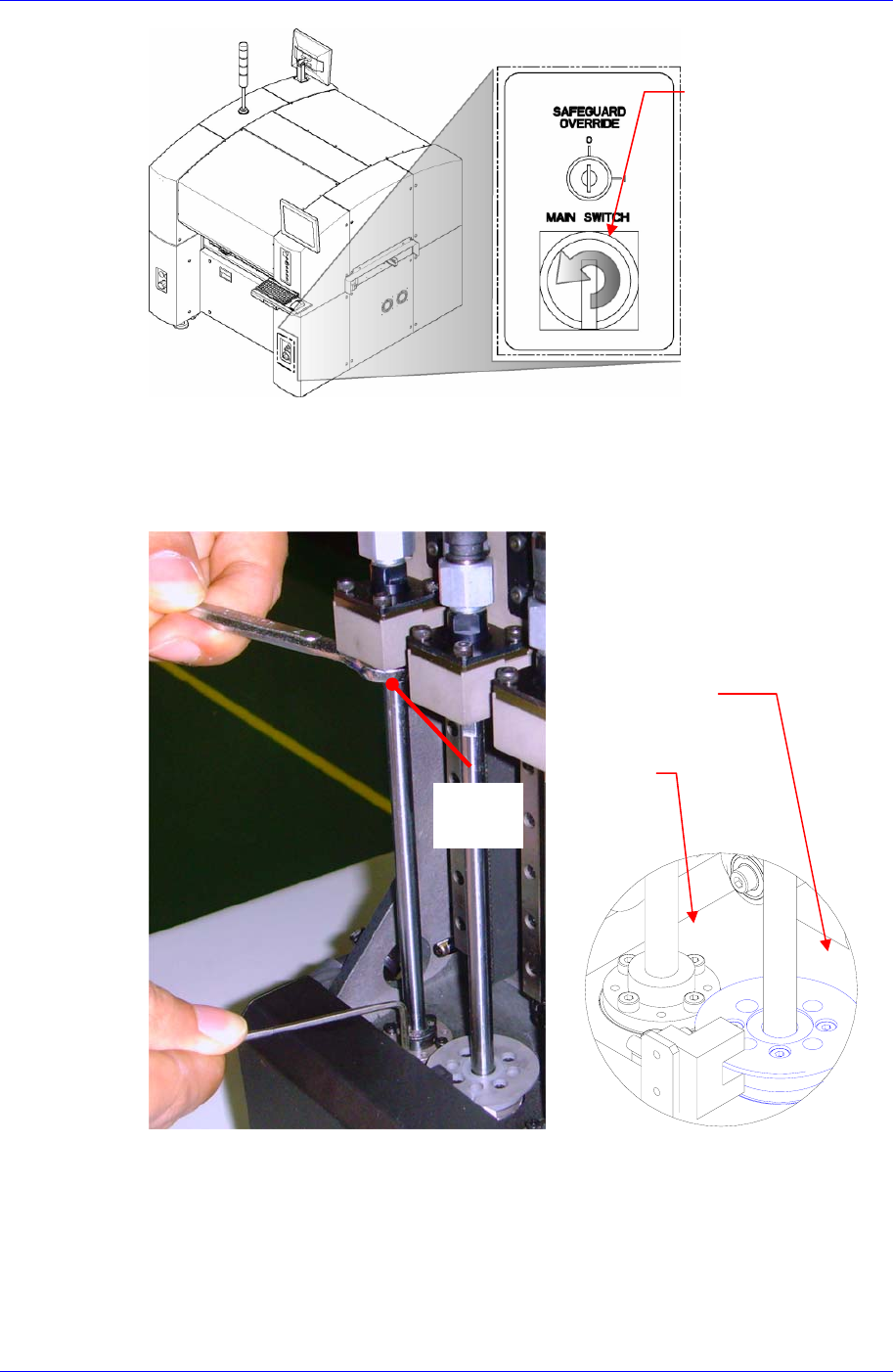 Samsung Component Placer SM321 Service Manual 4-56 3. 分离 R 轴 sens or dog 时,用扳手 (7mm) 夹紧 home(A) ,利用扳手除去下图的固定螺 丝 (M2–4 个 ) 。 然后,利用扳手除去连接 Ball Spline Nut 和 Spline Housing Ass’y 的下图中 1 号固定 螺丝 (M2–4 个 ) 。 Main Switch 关闭方 向 (…
