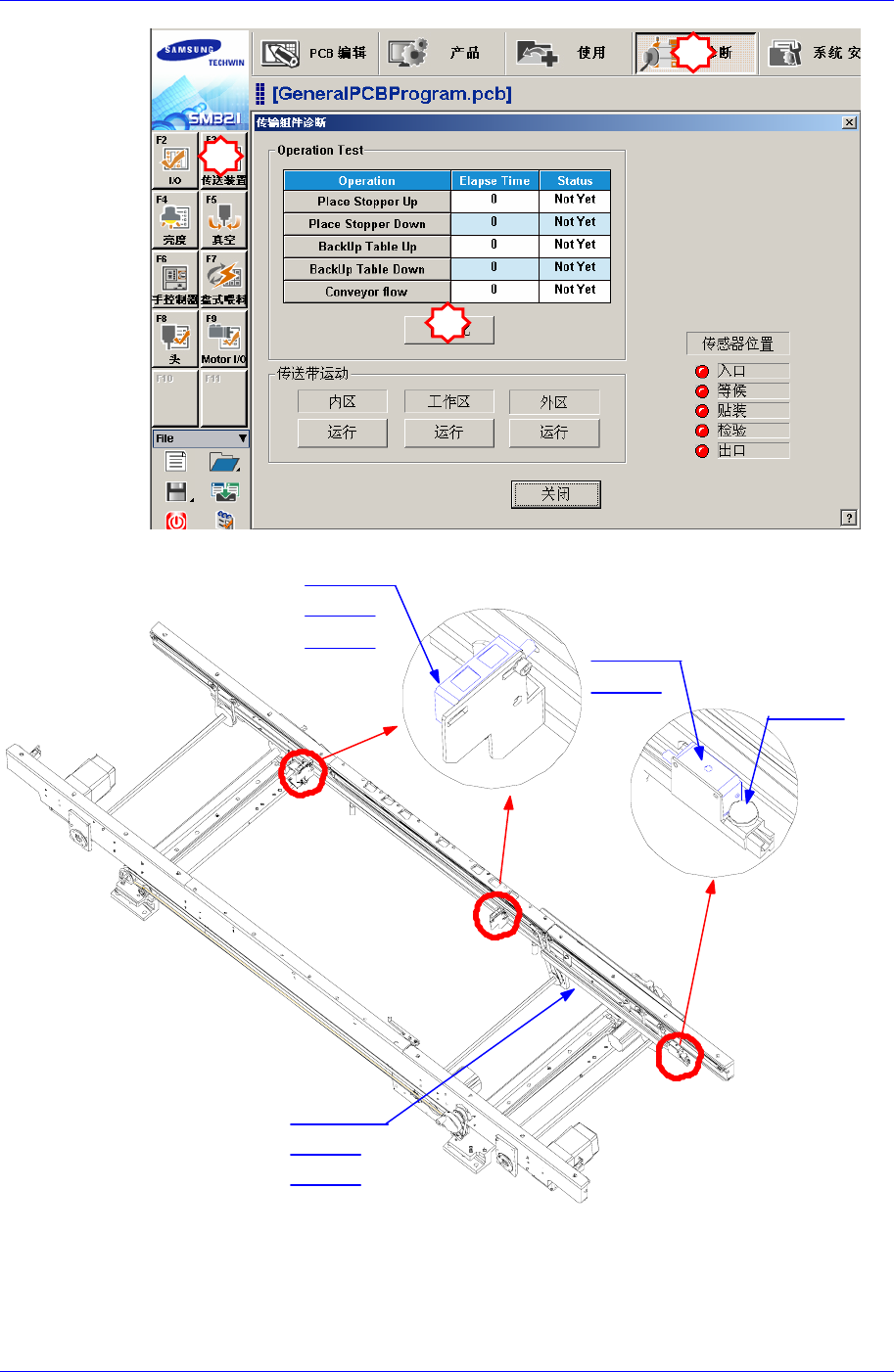 7. 为了确认传感器工作与否,请执行“Conveyor Module Diagnosis”对话框。请点