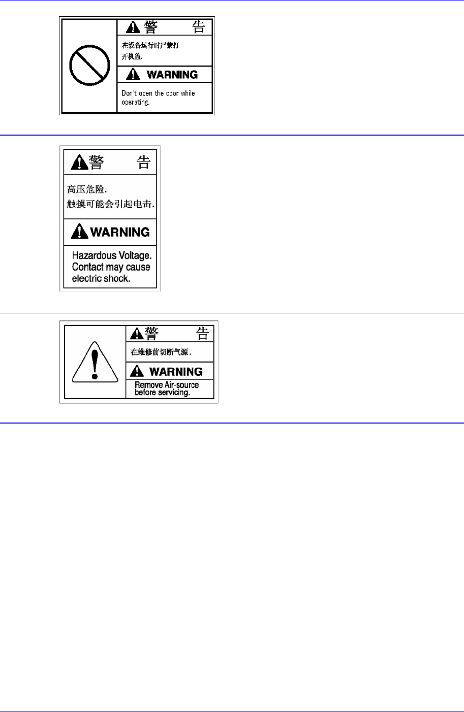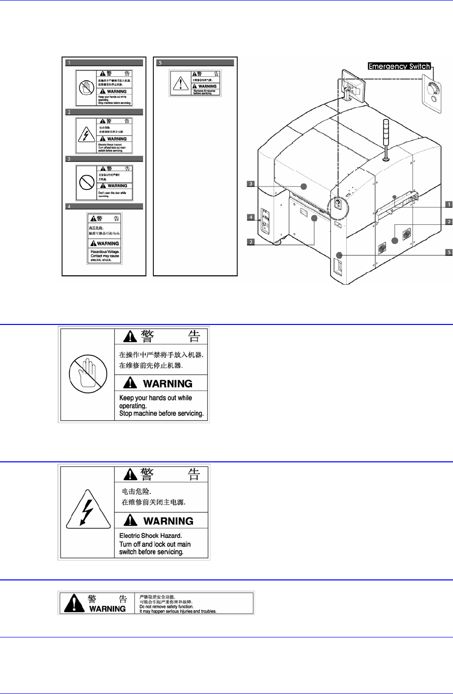 Samsung Component Placer SM321 Service Manual vi 运行中禁止手触摸 贴有此标签的位置设置有移动体 ,在运行时 如果分解移动体或将盖子打开, 身体某部分 伸入到设备内部是非常危险的。 注意触电 可能会受到致命伤害 维修检查前请切断空气源