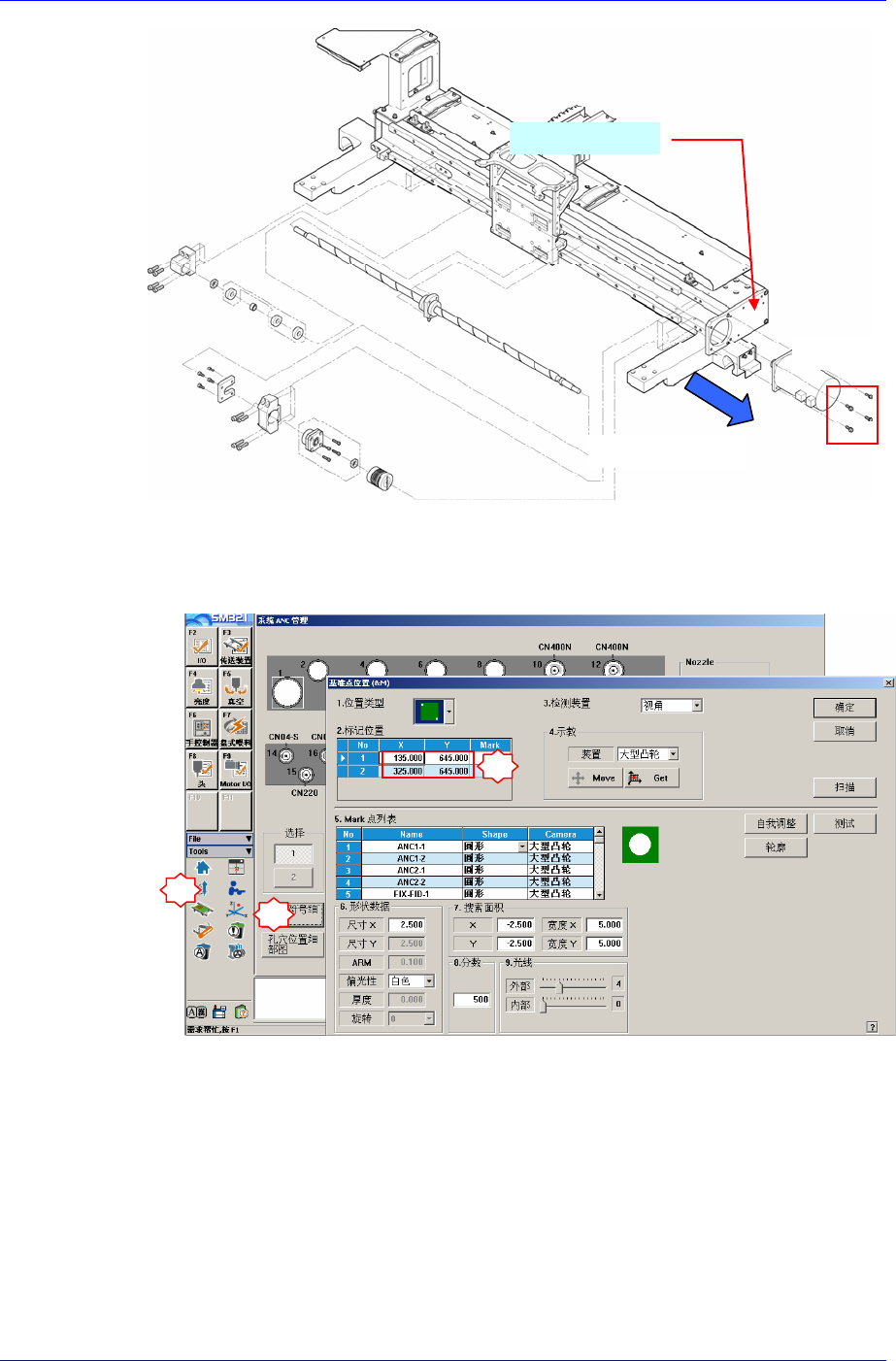 X-Y Frame 6-1 1 7. 组装是拆卸 的倒序。作业完成后打开设备前 面的 Main Switch ,启动 PC 。 8. 请重新示教 设备基准坐标点。 ANC 顶面的 Fiducial 2 点 END Bracket-X 固定螺丝 电动机分离方向 1 2 3