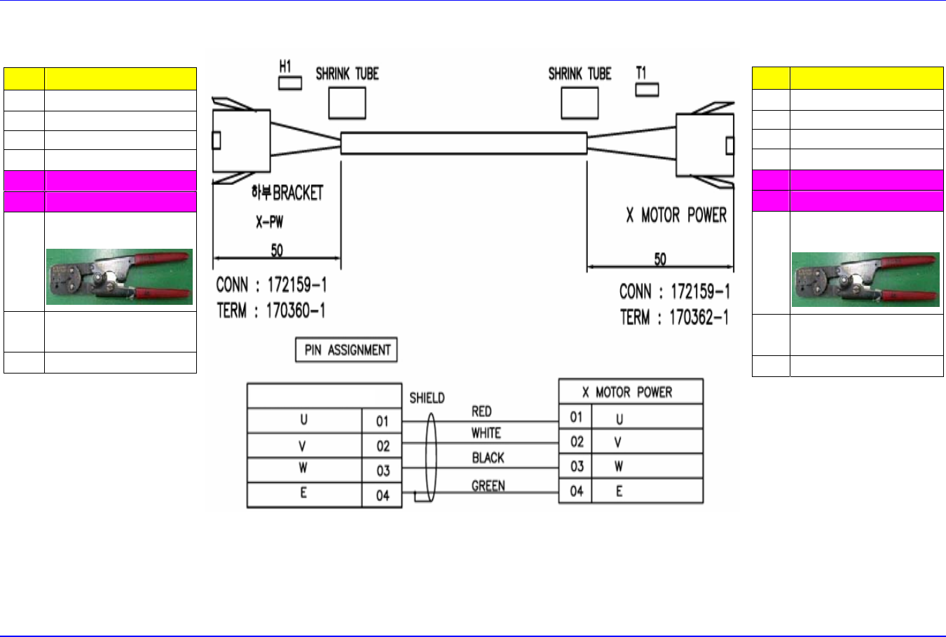 Flat Cable 作业指南 9-3 9.4. Flat Cable Connector 作业方法 9.4.1. X Axis Motor Encoder Cable (No. 1) TWIST PAIRED线 底 部 Br ac k et X-E N 项目 详细内容 位置 X Motor Maker AMP Pin 172160-1 连接器 170361-1 购买处 TYCO 国内代理 店 价格 作业 工具 规格 -HTR 2445…