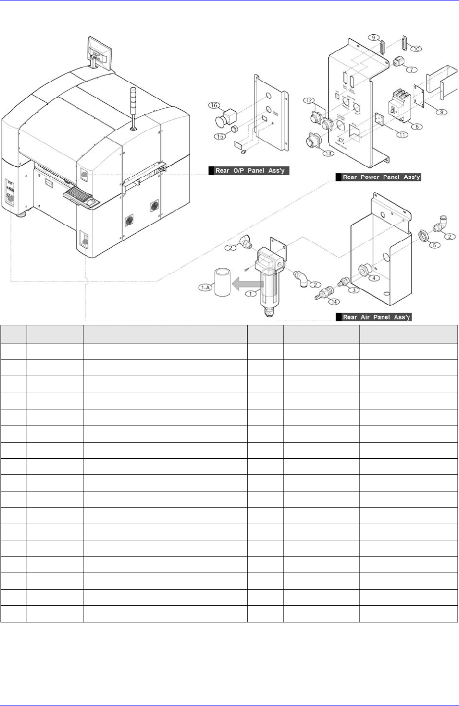Samsung Component Placer SM321 Service Manual 11-10 11.3.2. Rear Function Panel Ass’y NO. P ART NO. P ART NAME Q’TY TYPE REMARK 1 J6708016A AIR FIL TER 1 AF40-04BC 1 1-A J6708018A FIL TER ELEMENT 1 AF40P-060S 1-A 2 J1301…