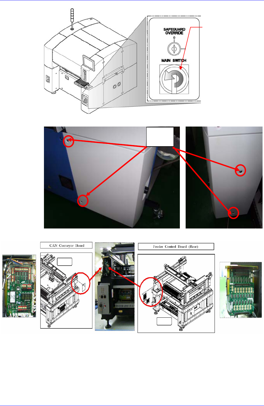 Boar d Ass’y 13-23 4. 利用 Driver 拧开固定螺丝分离相应 Board 后替换 Board 。 5. 组装时为拆 卸的倒序。 6. 打开设备前 面的 Main Switch 后,测试相应板关联设备的 动作,确认是否正常。 13.4.5. Rear Lower 部 Safety Control & Connection Board / Stepping Power Board Conveyor Sub…