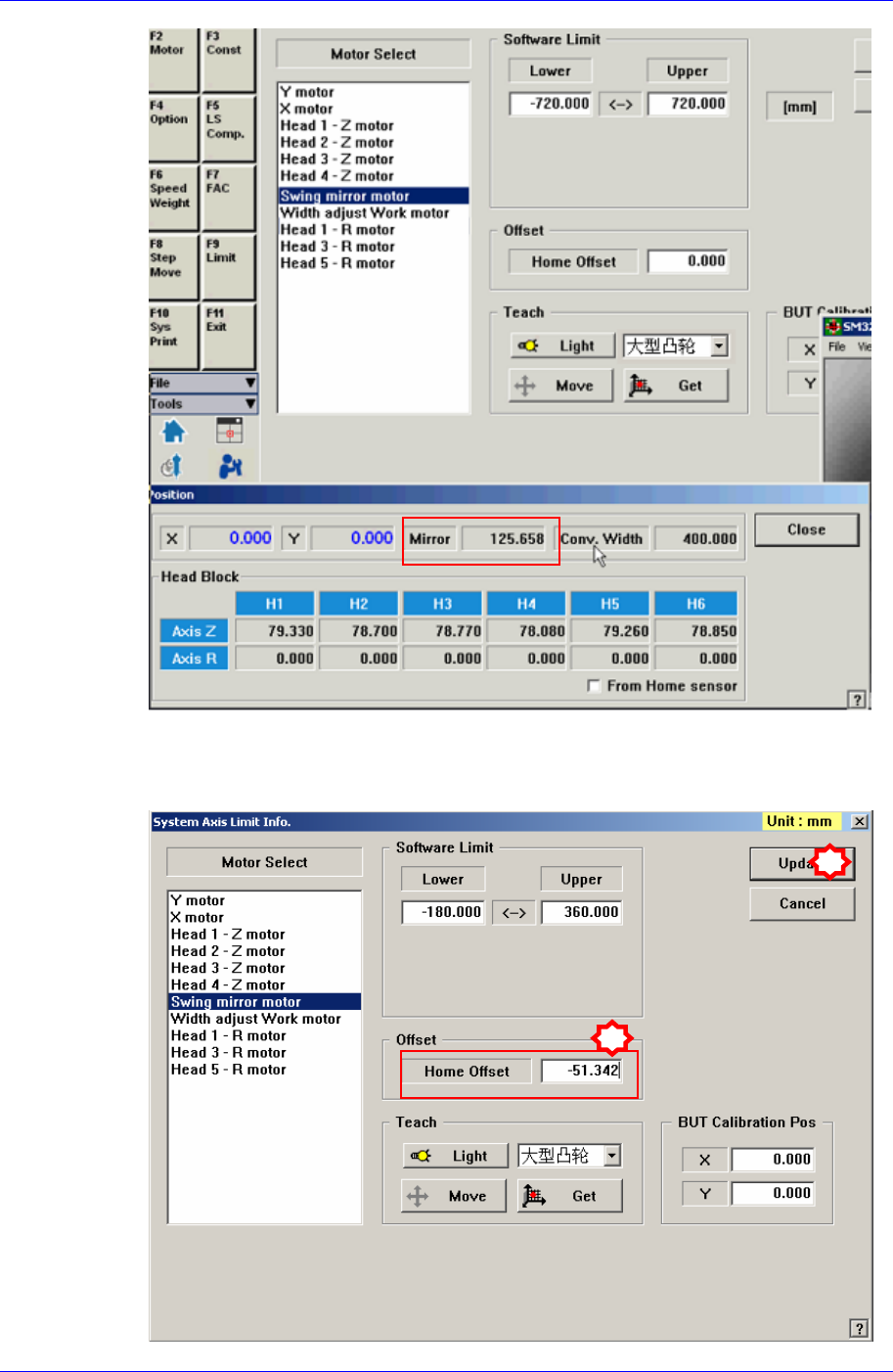 8. 请确认Current Position对话框标示的Mirror Data,测定及输入如下Offset值。