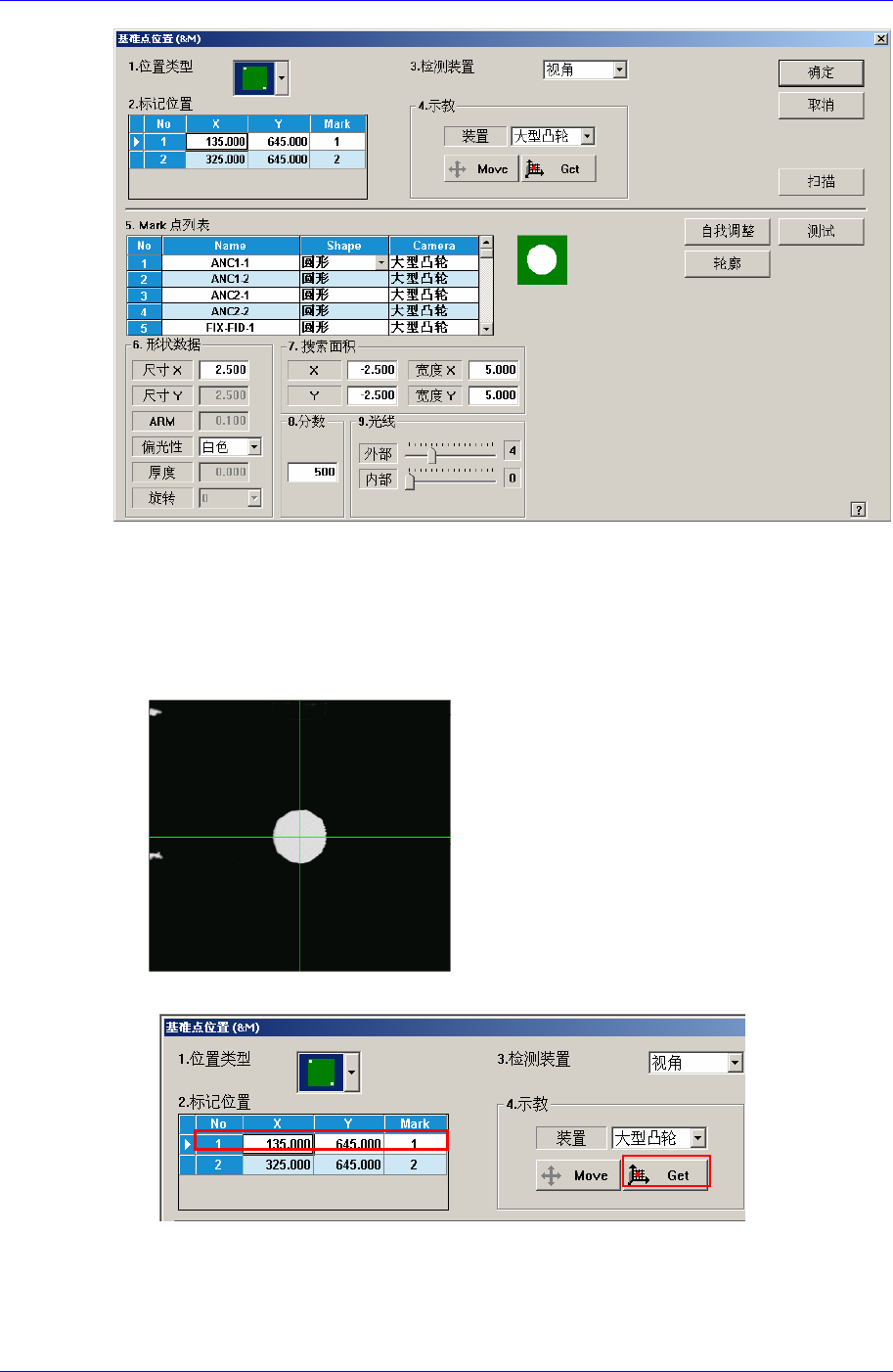 基准标对准’SM321VIS’框的中心后点击<Get>按钮输入当前位置。ANC基准标示教