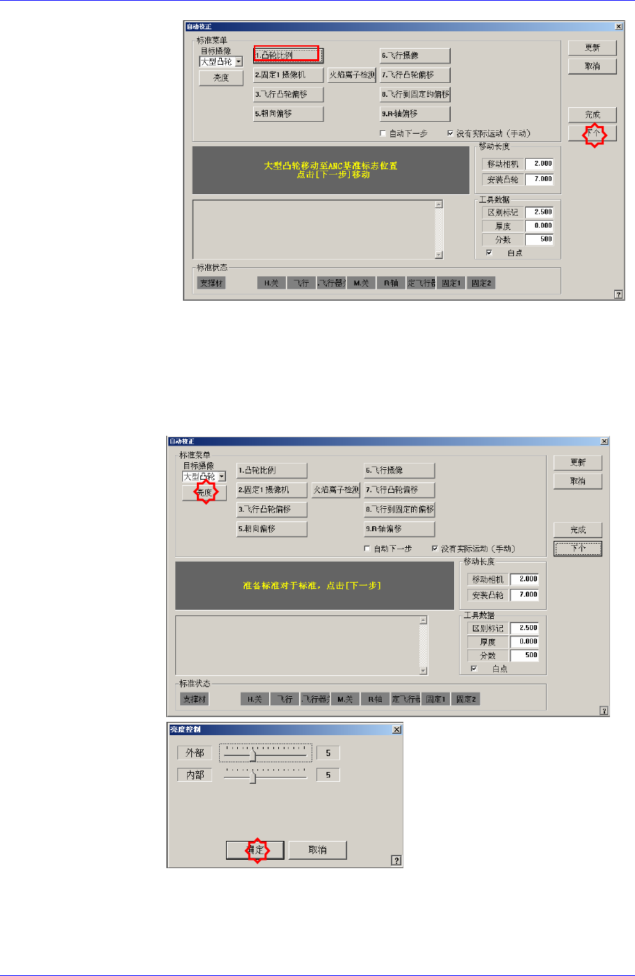 Calibration 3-29 2. 点击 <1. 凸轮比例 > 按钮则在消息框显示 “ 大型凸轮移动至 ANC 基 准标志位置。点击 [ 下一步 ] 移动 ” 消息。为了把 Fiducial Camera 移 动到 ANC 的 Fiducial Mark 位置,请点击 < 下个 > 按钮。 3. 显示 “ 准备标准。对于标准,点击 [ 下一步 ]” 消息。此时,点击 < 亮 度 > 后在 “ 亮度…