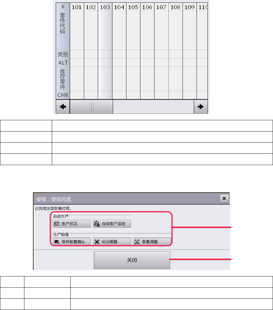 第 4 章 操作篇 4- 3. 自动生产 4 画面切换按钮的详情 根据运转模式的 不同,显示的 按钮有所不同。 运转模式 菜单 按钮的种类 说明 正常 自动生产 生产状况 切换为生产状况 画面。 自动生产设定 切换为自定生产 设定画面。 试用 自动生产 生产状况 切换为生产状况 画面。 自动生产设定 切换为自定生产 设定画面。 生产助理 零件吸着测试 切换为零件吸附 测试画面。 零件装着确认 切换为零件安装 确认画面。 标记调整 切换为…
