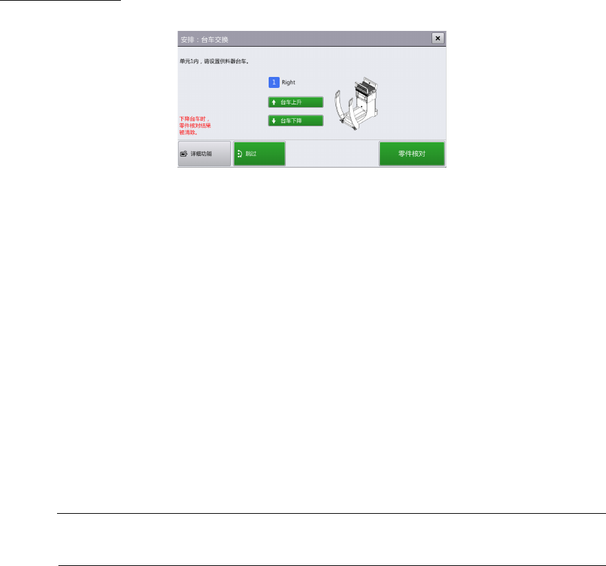 更换台车后,(台车不上升)触摸[零件核对],显示[安排:核对零件]。