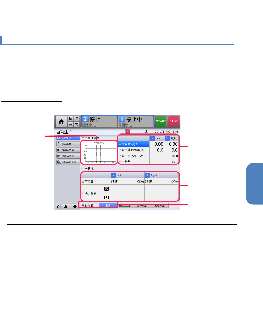 第 4 章 操作篇 4- 3. 自动生产 停止模式 显示于[生产状 况]画面的下 方。 在开始自动生产 前设定。 • 继续 :触摸[ STOP ],或在完成生产预定块 数时停止。 • 循环停止:完成 1 块基板时 停止。 • 路径停止:完成 从吸附到安装 的一次动作时停止。 • 动作停止:以 1 个动作为单位停止 。在标记识别位置, 零件吸附位置 ,固定相机识别位置 ,安装 位置,废弃位置 的任意一处停 止。 显示生产进度状 况 生产时…