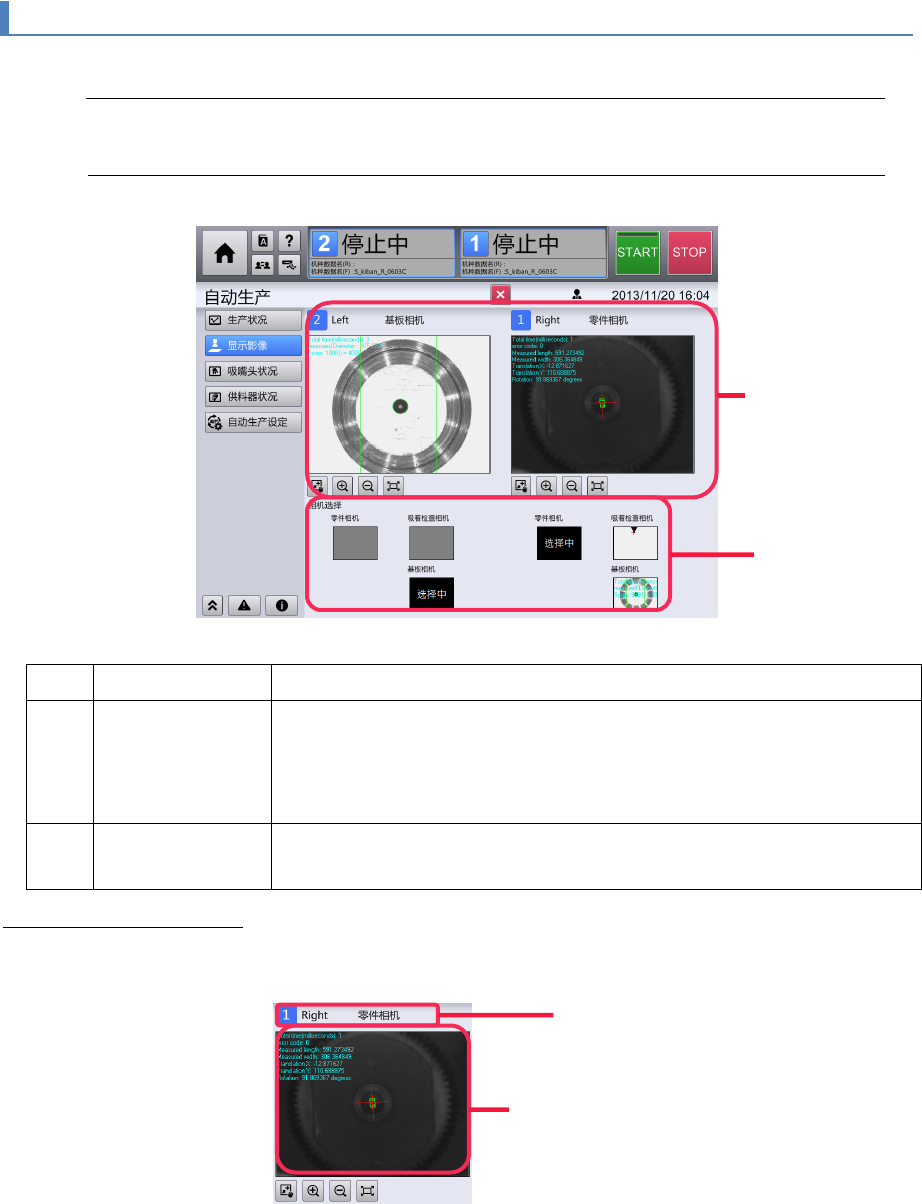 第 4 章 操作篇 4- 3. 自动生产 4-3-4. 相机显示 触摸 [自动生产]画面子菜单 面板中的[显 示影像],可显示[ 显示影像]画 面。 注意 • 如果在[显示影 像]画面状态 下生产,节拍时间会 降低。 记号 名称 说明 (a) 选中相机的显 示,操作 放大显示相机选 择区域 (b ) 中选择的相 机图像。 装置 2 的相机信息显示于左侧,装 置 1 的相机信息显 示于右侧。 此外,针对选中 相机的图像( 识别结果),进行…