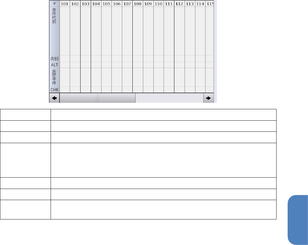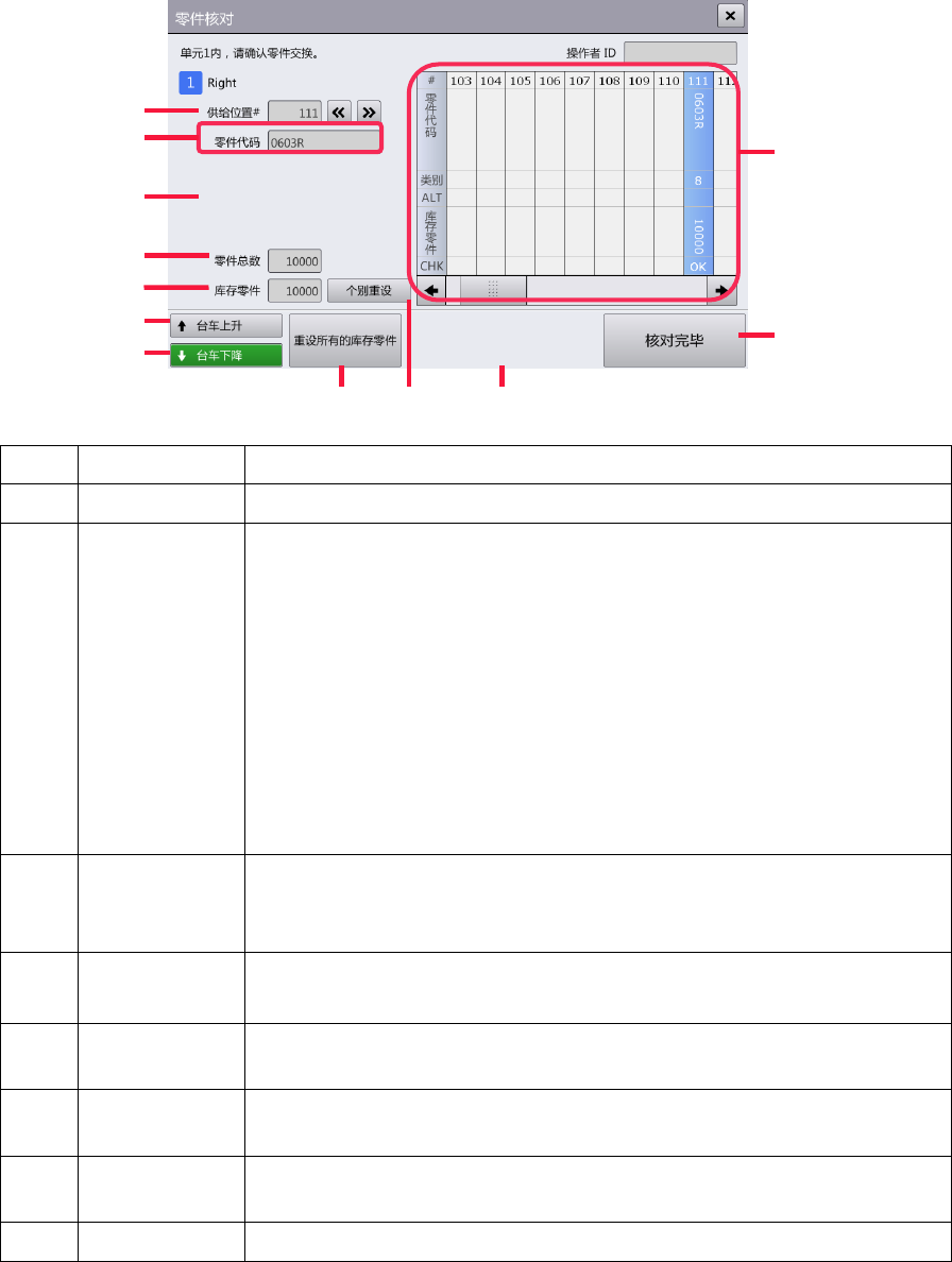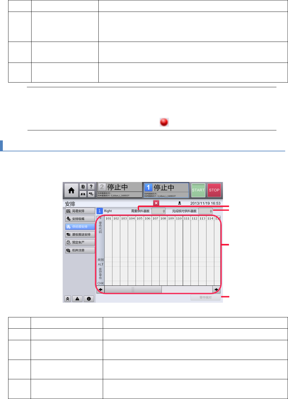 第 4 章 操作篇 4- 5. 计划 4 零件供给部列表 显示 说明 # 显示供给位置编 号。 零件代码 显示生产时所用 零件的零件代 码。 类别 显示所用带式供料器的 种类。 • 8 : 8mm • 12 : 12mm ALT 关于替代源的供 给位置,显示 替代源的供给位置编 号。 库存 零件 显示每个供给部的零件剩余数 。 CHK 触摸 [零件核对]后显示零件 核对对话框, 以 OK/NG 显示通过该对话框进行的 带式供料器核对…