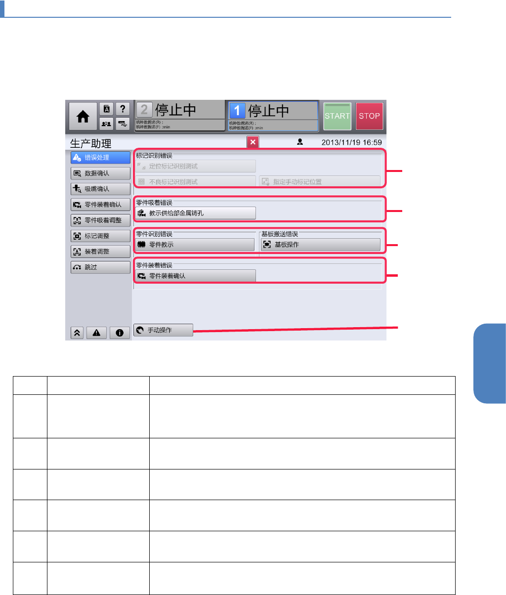 第 4 章 操作篇 4- 6. 生产助理 4 4-6-1. 错误处理 触摸 [生产助理]画面子菜单 面板中的[错 误处理],显示[错 误处理]画面 。 [错误处理]画 面中,将根据 生产过程中(运行中 )发生的错误 内容,显示相应的功 能对话框,通 过各 对话框中的操作 恢复为生产状 态。 记号 名称 说明 (a) 标记 识别错误 触摸 [定位标记识别测试], [不良标记识 别测试],[基板条 码 识别测试],[ 指定手动标记 位置],…