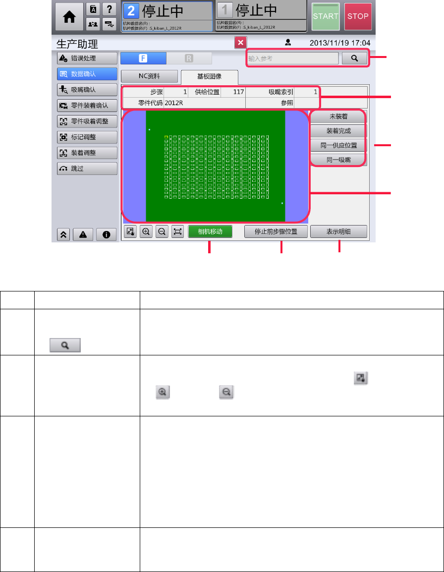 第 4 章 操作篇 4- 6. 生产助理 [基板图像] 选项卡 显示当前正在生 产的机种数据 的基板示意图。 记号 名称 说明 (a) 部件名搜索文本 框 / 部 件名搜索按钮 ( ) 以部件名为关键 字,从选择的 步骤中搜索数据(部 分搜索 * )。存在 匹配数据时,将 把基板示意图 对应的步骤位置变为 选择状态。 * 可以只使用 部件名的一部分搜索。 (b) 基 板示意图 显示对象轨道上 正在生产的基 板示意图。针对显示 的基板…