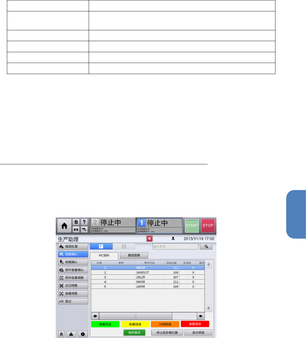第 4 章 操作篇 4- 6. 生产助理 3 触摸 F/R ,选择轨道。 4 在 NC 数据列表中选择步骤。 5 触摸[表示明细],在选中步骤的详情中显示数据。 显示 [ NC 资料 / 零件资料明细 ]对话框。 Tips • 触摸 [相机移动],将相机移 动到选中步骤 的安装位置上,在[ 相机操作]对 话框中 显示图像。要返 回数据确认画 面,请触摸对话框中 的 。 • 触摸 [停止前步骤位置],选 择停止前的步 骤。开始生产前选择 …