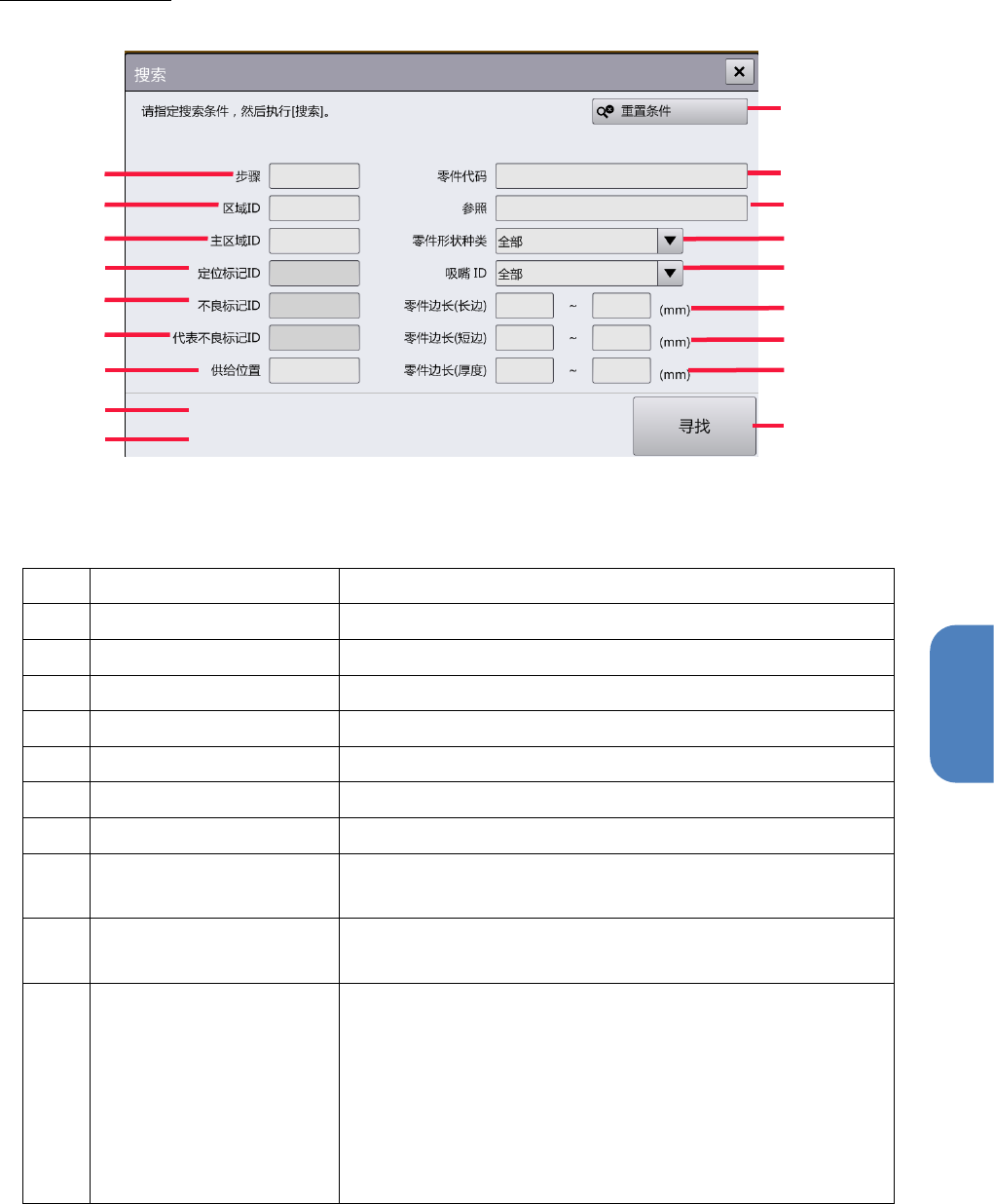 第 4 章 操作篇 4- 6. 生产助理 2 触摸 F/R ,选择轨道。 3 触摸[搜索],显示[搜索]对话框。 有关 [搜索]对话框的详情, 请参阅下述的 “搜索对话框的详情 ”。 4 在[搜索]对话框中设定各个项目,触摸[寻找]。 将在安装步骤列 表中显示的安 装步骤数据中搜索。 5 从安装步骤列表中选择要进行安装确认的步骤。 6 触摸[基板操作]。 显示 [基板操作]对话框。 有关 [基板操作]对话框的详 情,请参阅下 述的“基板…