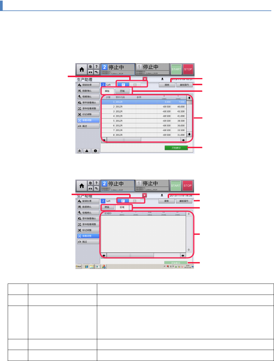 第 4 章 操作篇 4- 6. 生产助理 4 记号 名称 说明 (e) 搜索 显示 [搜索]对话框。 关于 [搜索]对话框的详情, 请参阅“ 4- 6- 5. ”的“搜索对话框 的详情 ” (f) 基板操作 显示 [基板操作]对话框。 关于 [基板操作]对话框的详 情,请参阅“ 4-6- 5. 零件 安装确 认”的“基板操 作对话框的操 作 ” (g) 开始教示 显示以下对话框 ,执行各标记 位置的示教。 • 焊垫教示对话框 • 区域 …